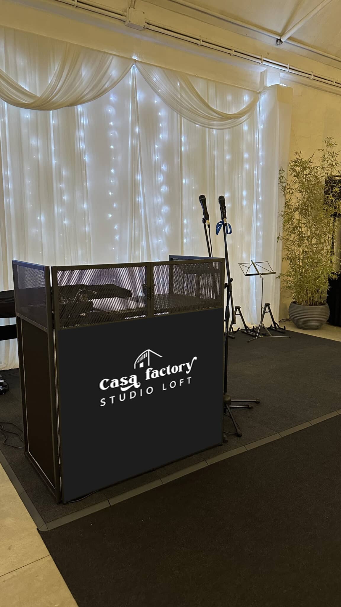 Lo Studio Loft include un'area palco, una cucina attrezzata con un grande bancone, una parete personalizzabile e un grande spazio centrale che può ospitare sedute per il pubblico o strutture.