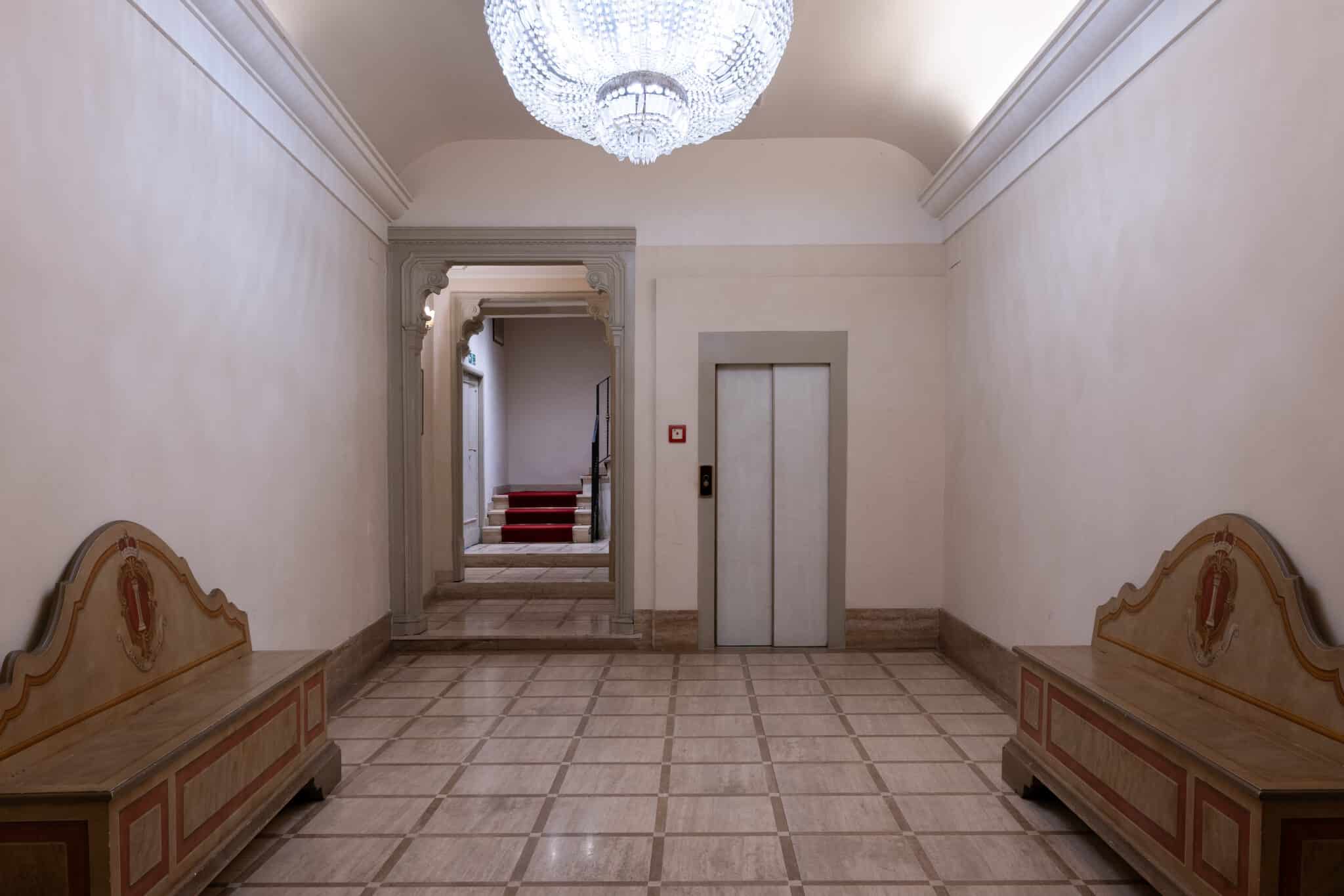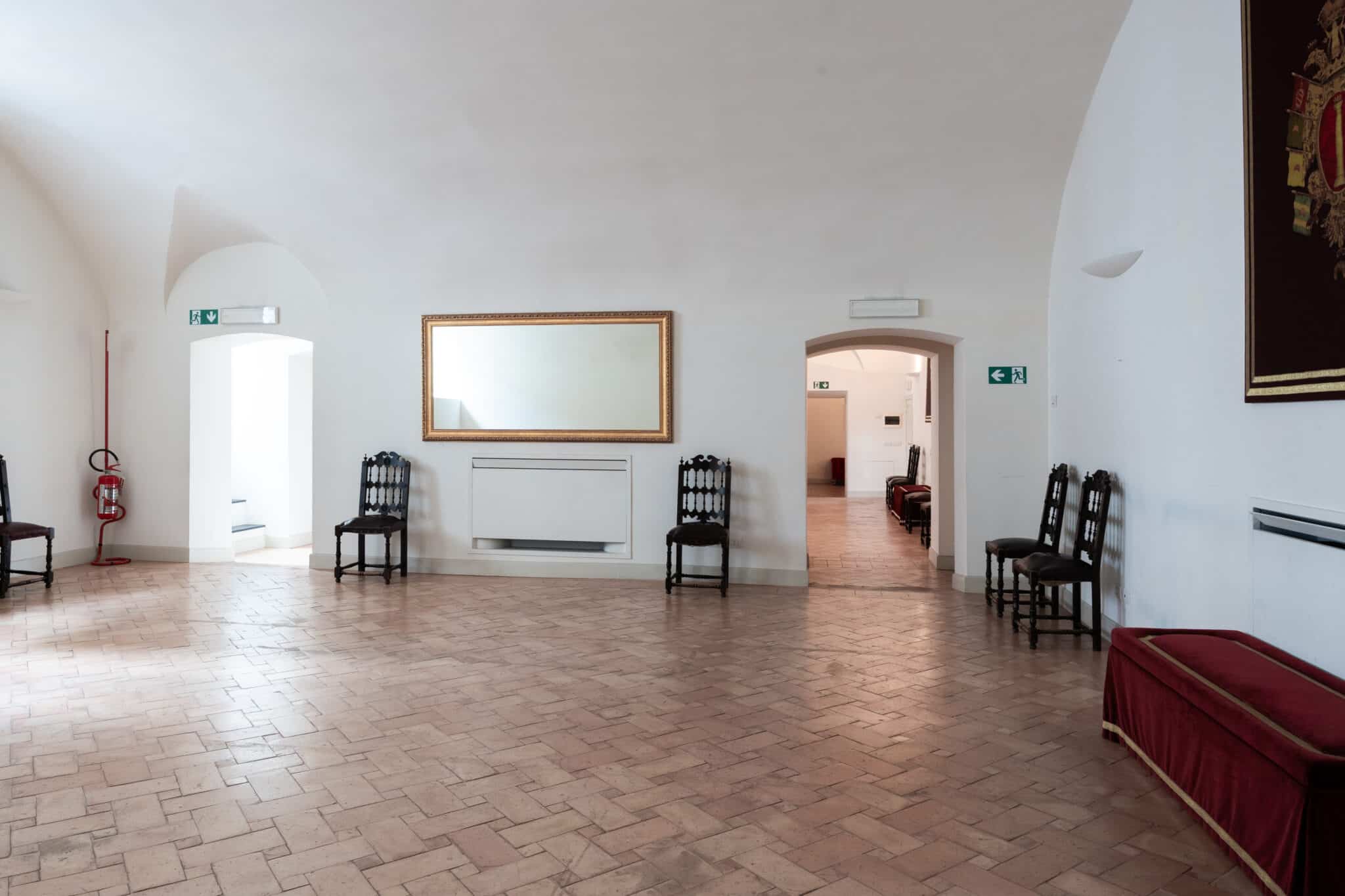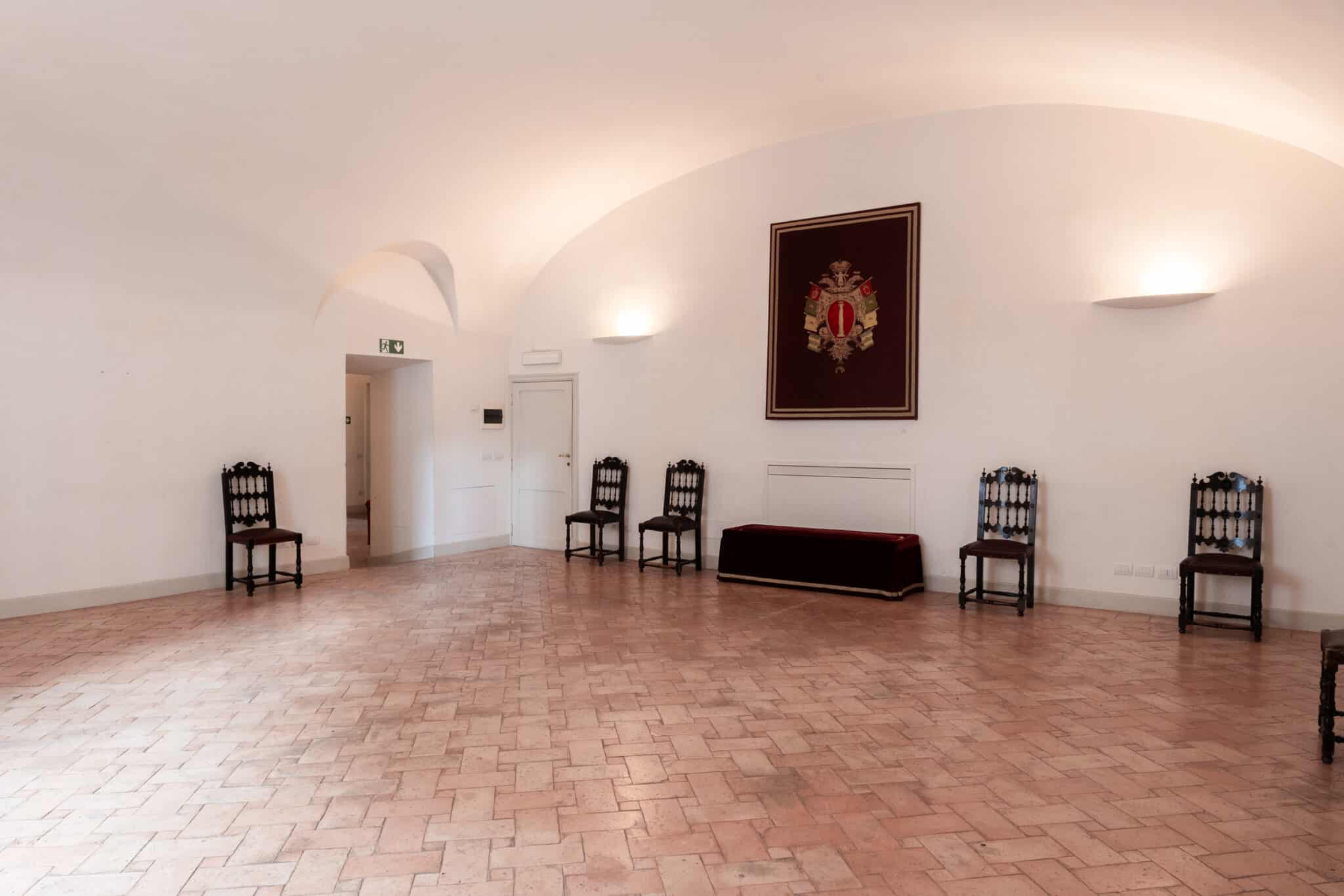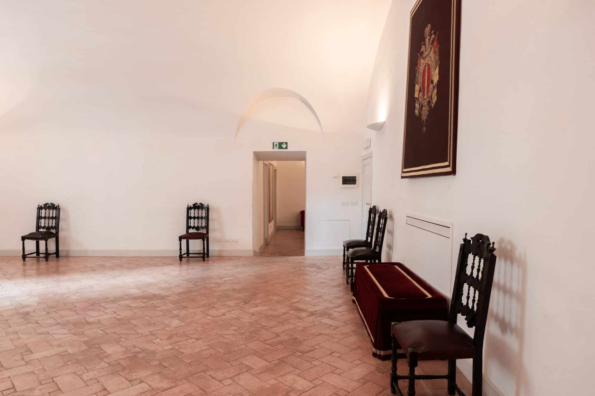 La presenza di arredi d’epoca, opere incorniciate e dettagli architettonici essenziali rende questa location particolarmente adatta a eventi eleganti, presentazioni, incontri istituzionali, mostre temporanee e produzioni fotografiche o video che richiedano un contesto storico autentico e di grande personalità.