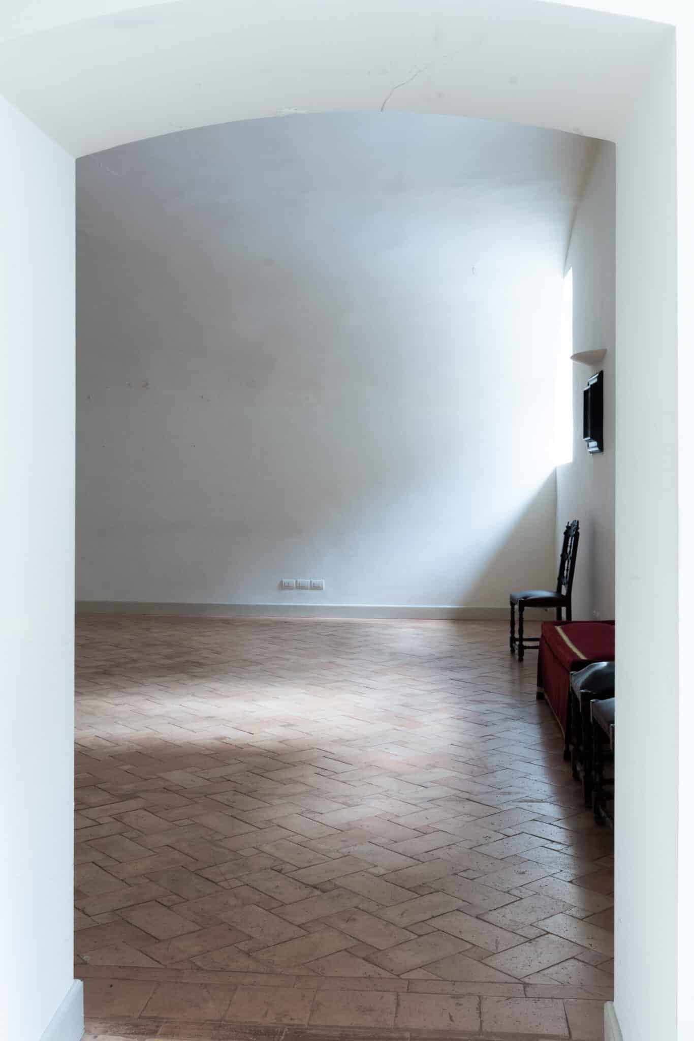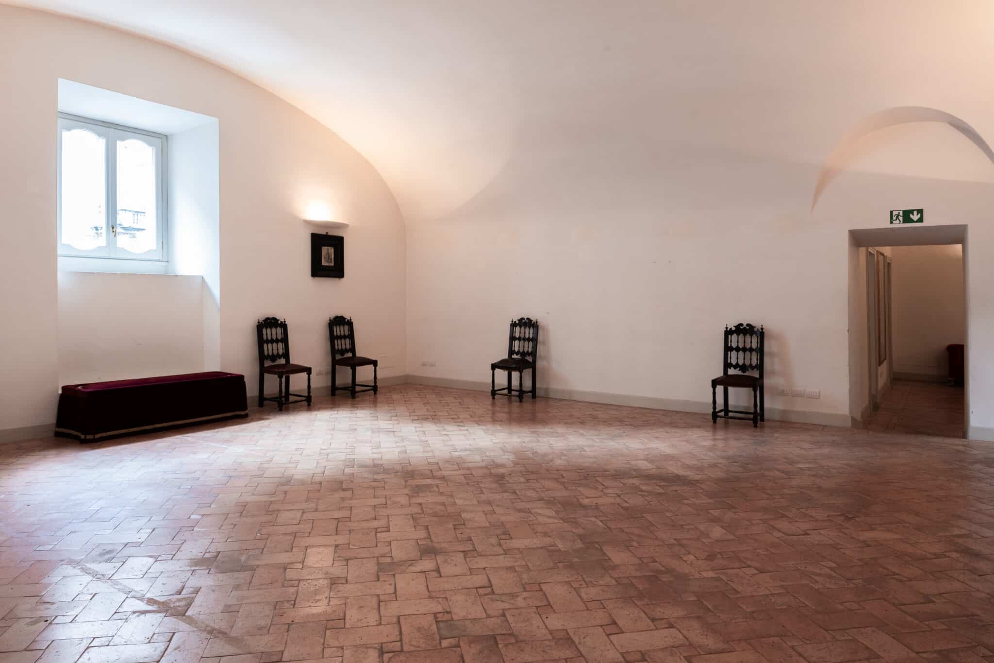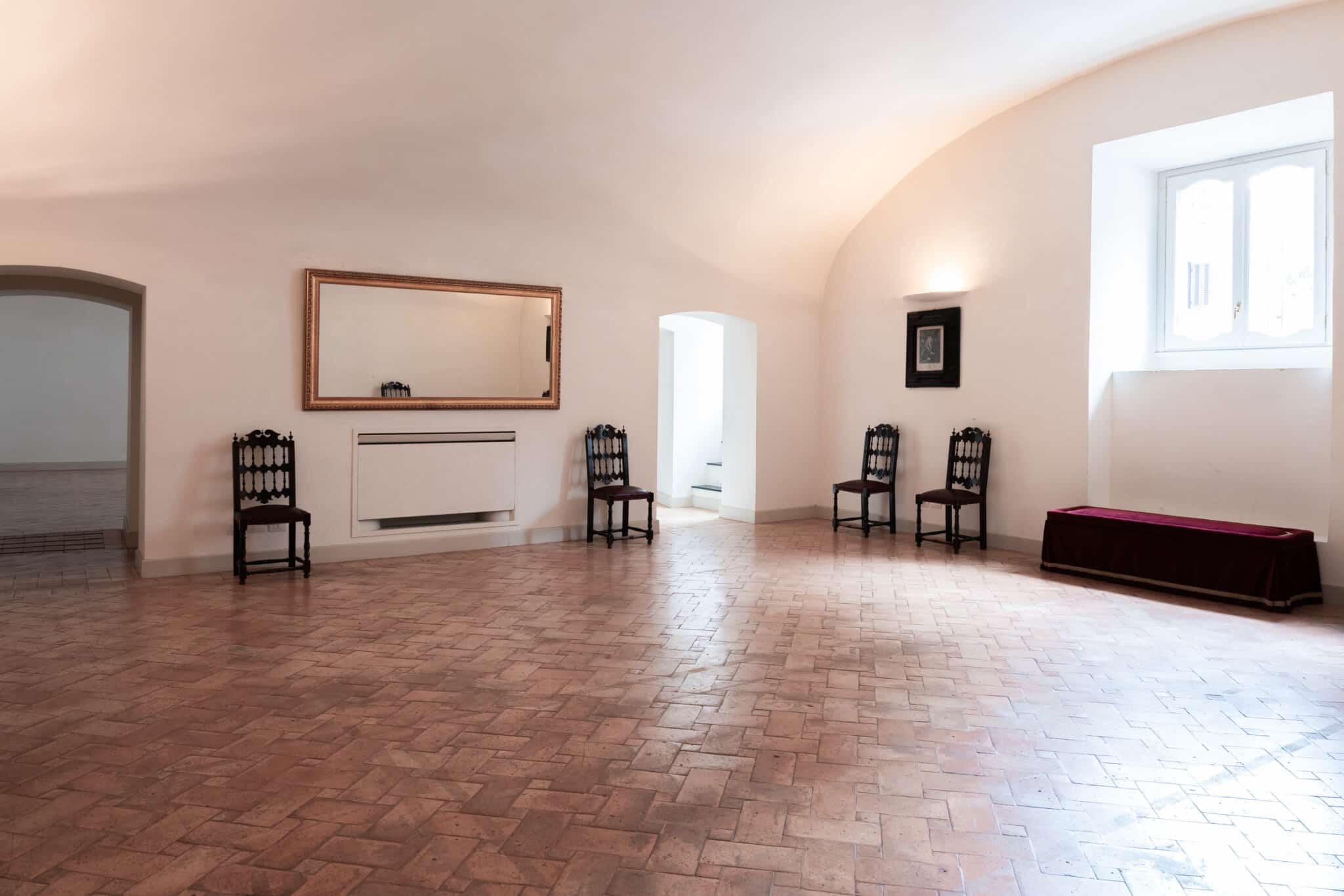 Le grandi volte a botte bianche definiscono uno spazio armonioso e luminoso, esaltato dalla luce naturale che filtra dalle finestre e si riflette sul pavimento in cotto posato a spina di pesce, creando un equilibrio raffinato tra calore e rigore architettonico.