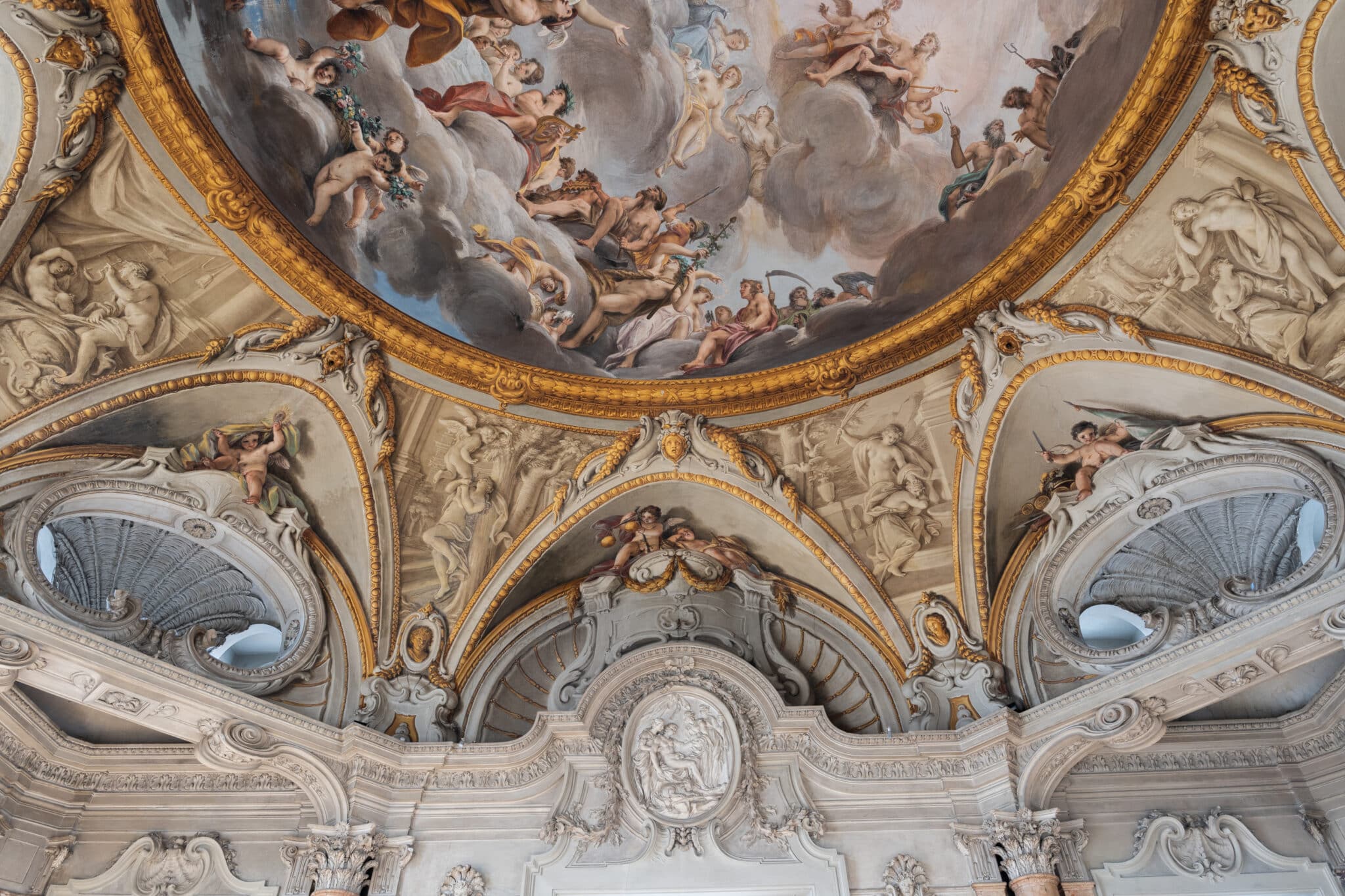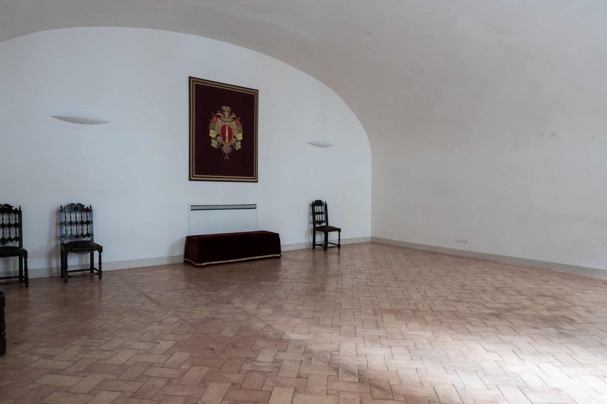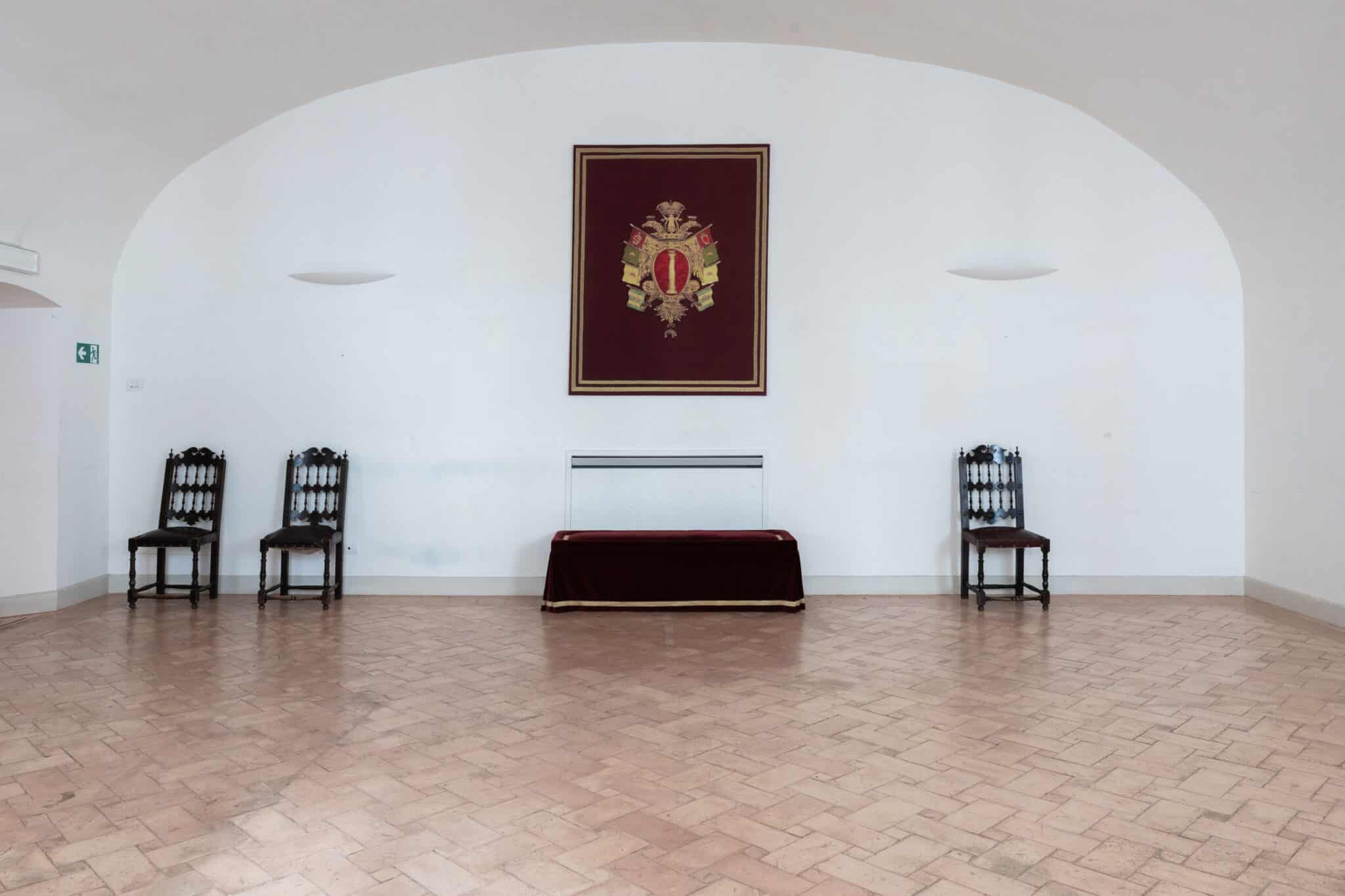 Lungo le pareti si susseguono sedute in legno scuro finemente lavorate e panche rivestite in velluto rosso, mentre uno stemma araldico di forte impatto visivo domina la parete principale, conferendo alla sala un carattere istituzionale e solenne.