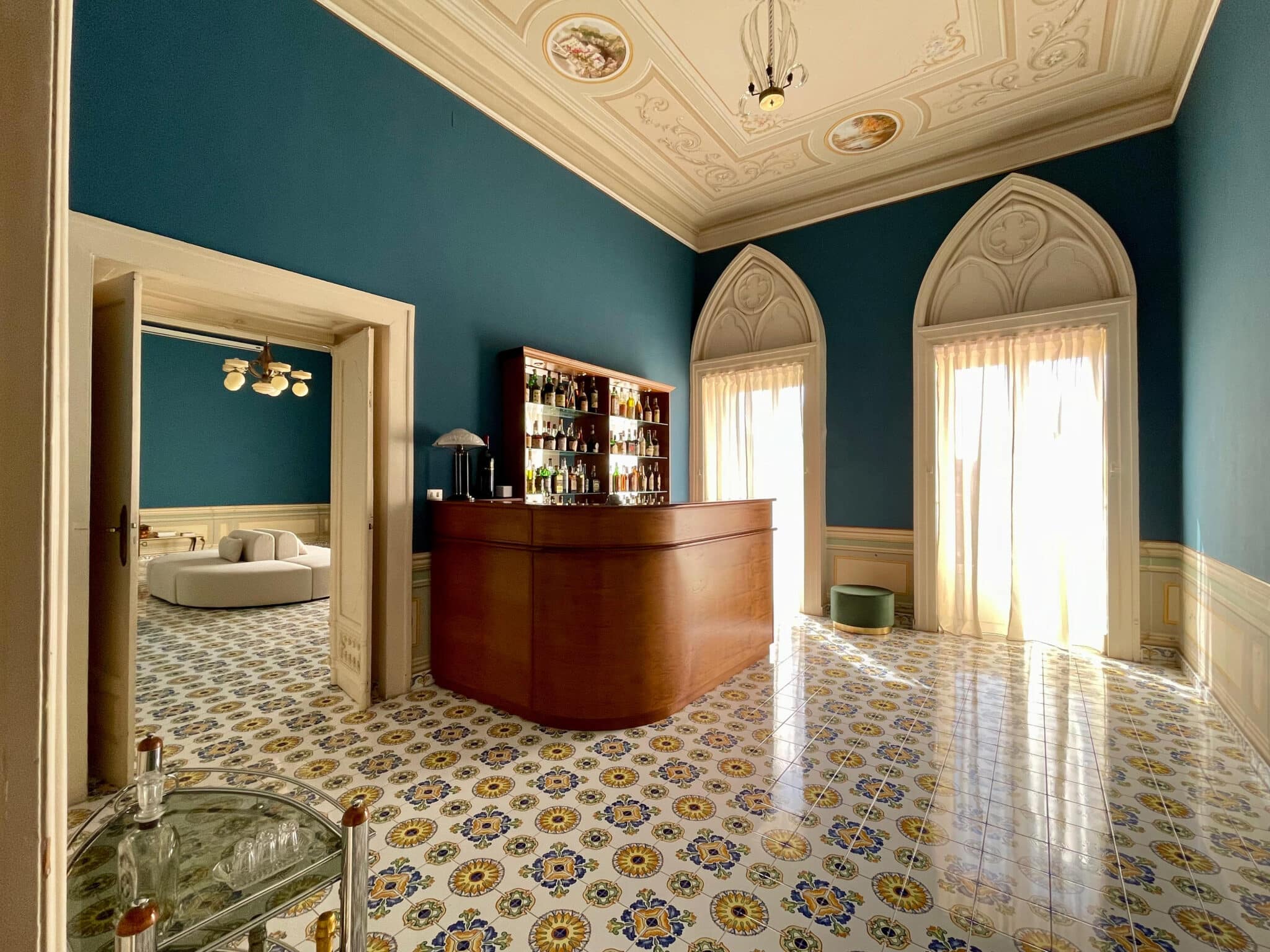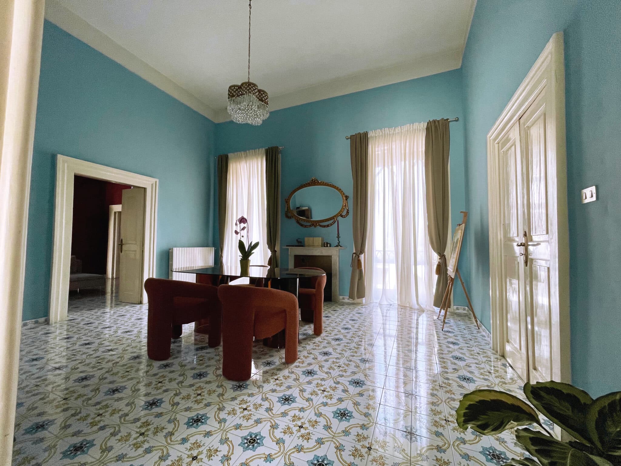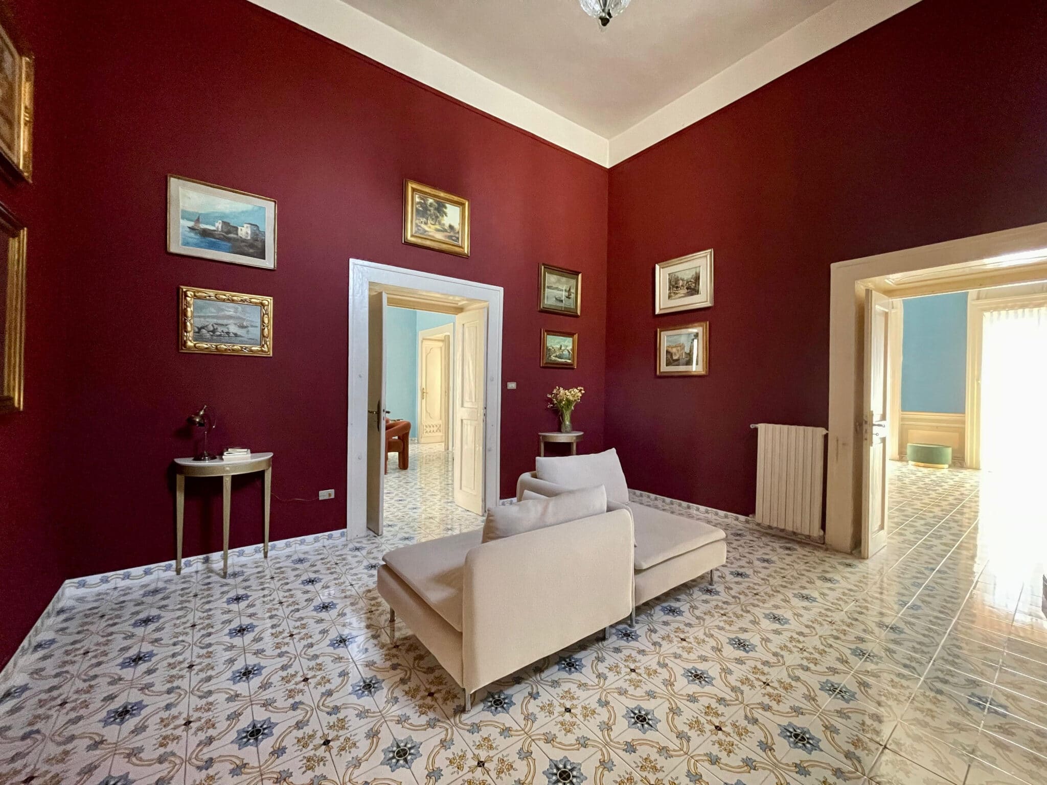 La dimora si sviluppa in otto ambienti che si susseguono come un percorso scenografico: corridoi, aperture architettoniche, affreschi e tonalità profonde accompagnano ogni momento, trasformando il soggiorno in un’esperienza intima ed immersiva.