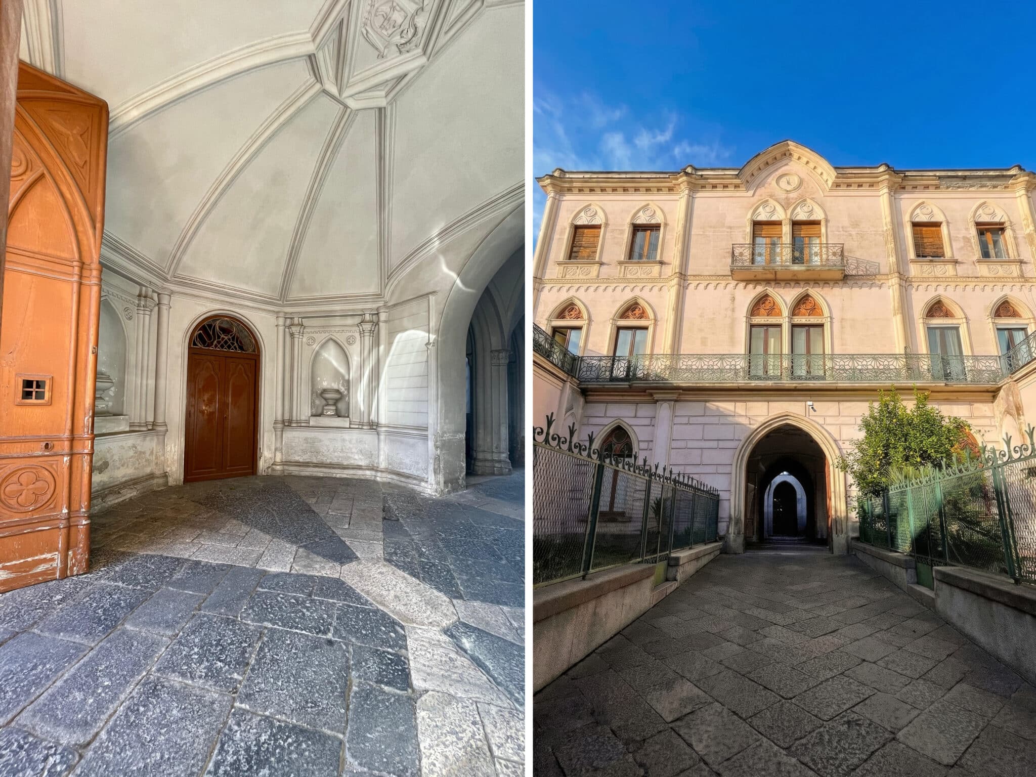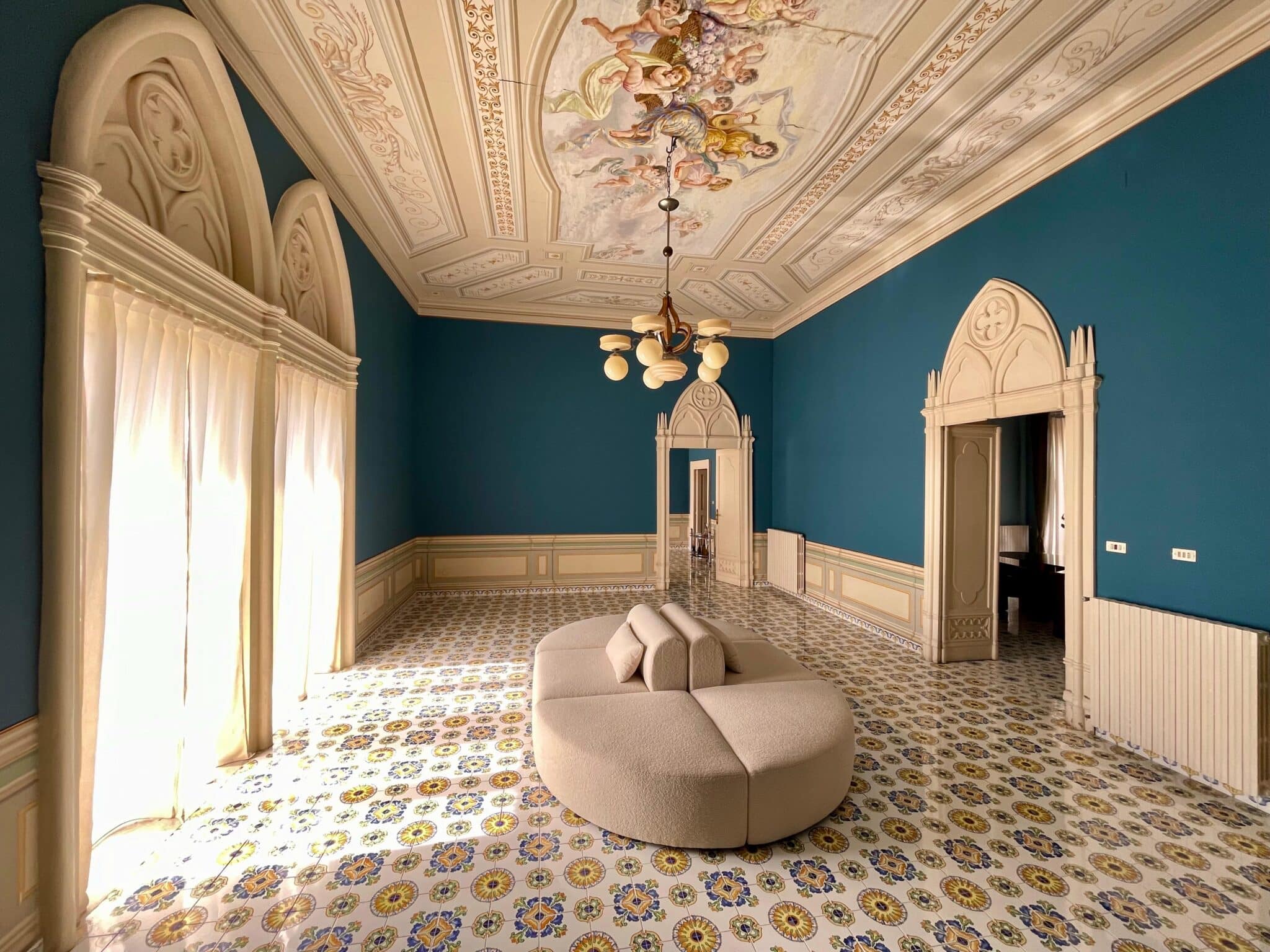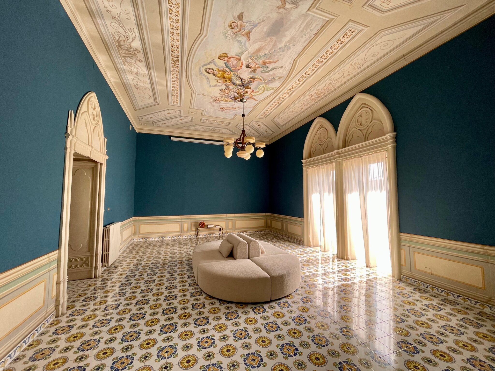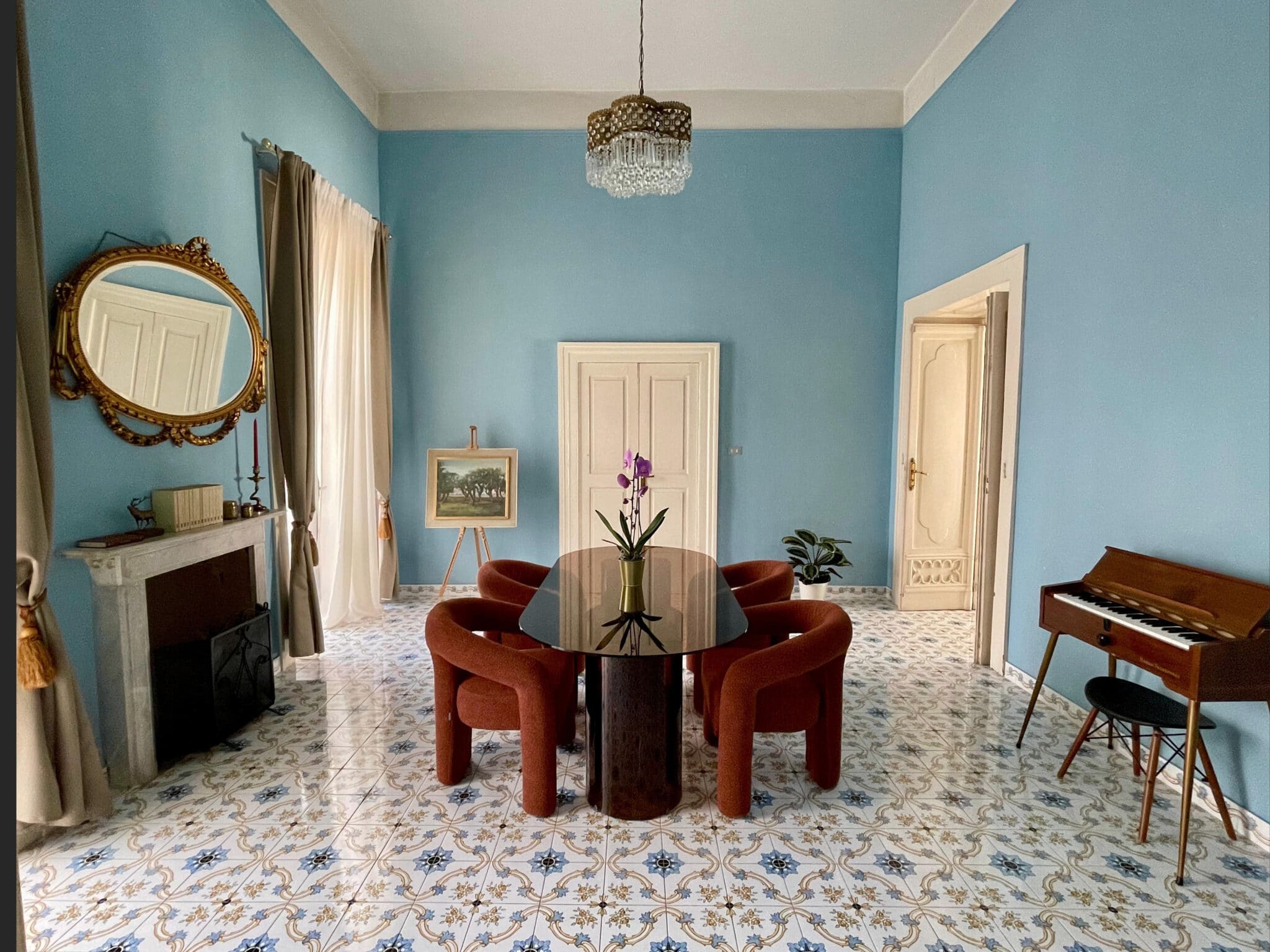 La dimora si sviluppa in otto ambienti che si susseguono come un percorso scenografico: corridoi, aperture architettoniche, affreschi e tonalità profonde accompagnano ogni momento, trasformando il soggiorno in un’esperienza intima ed immersiva.
