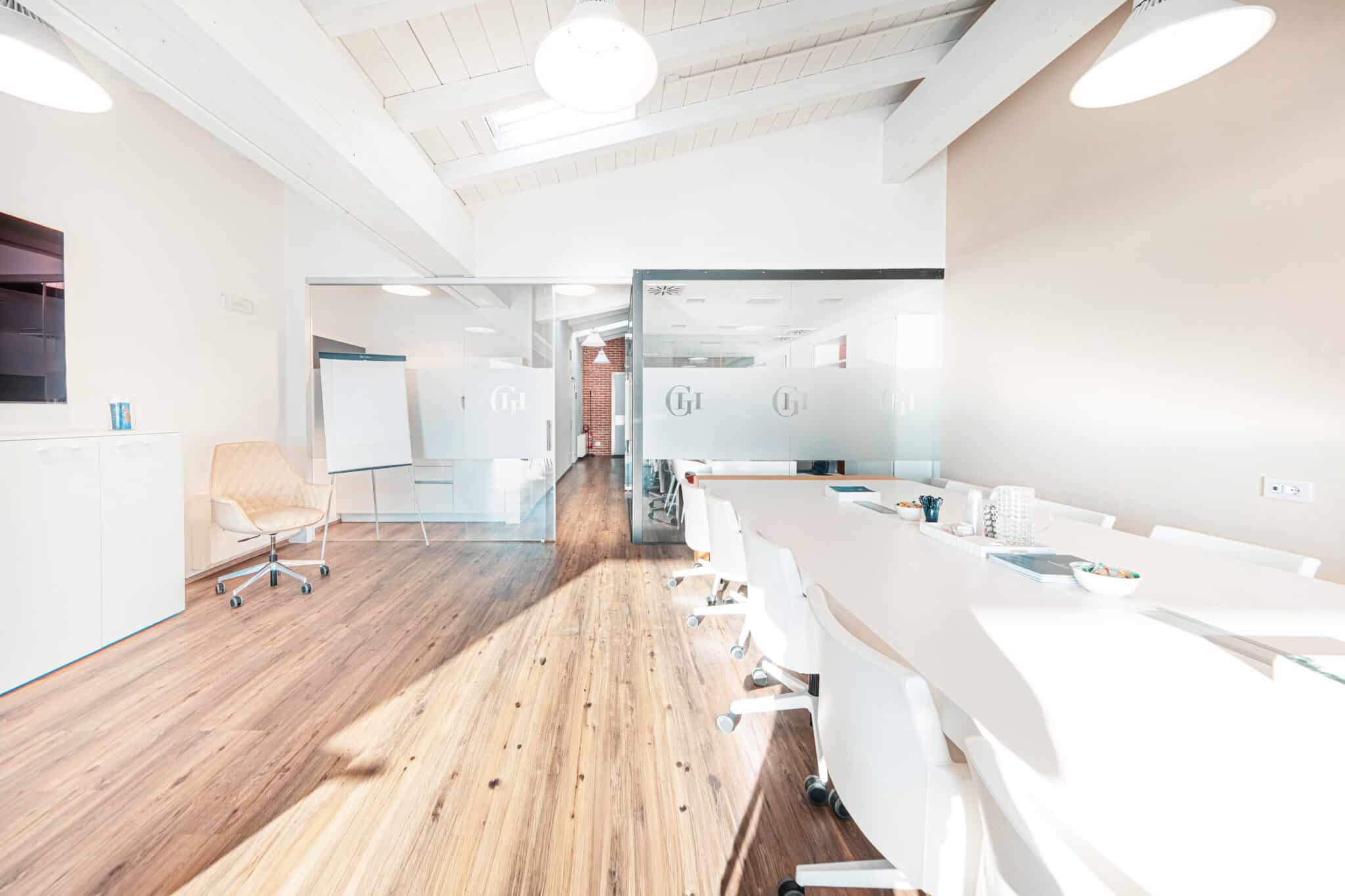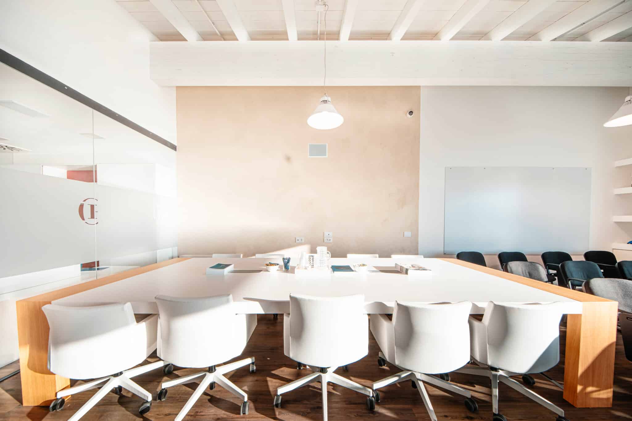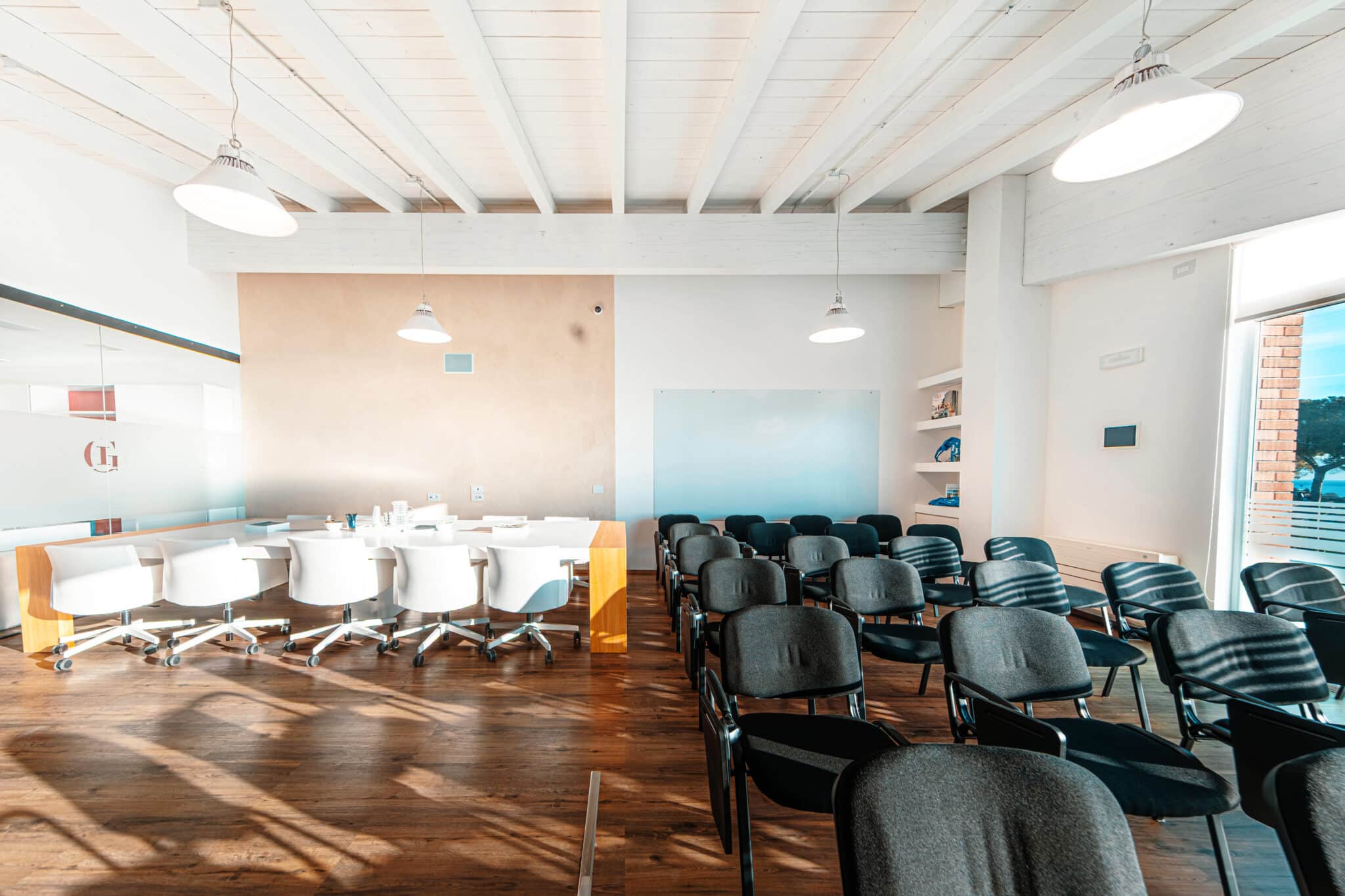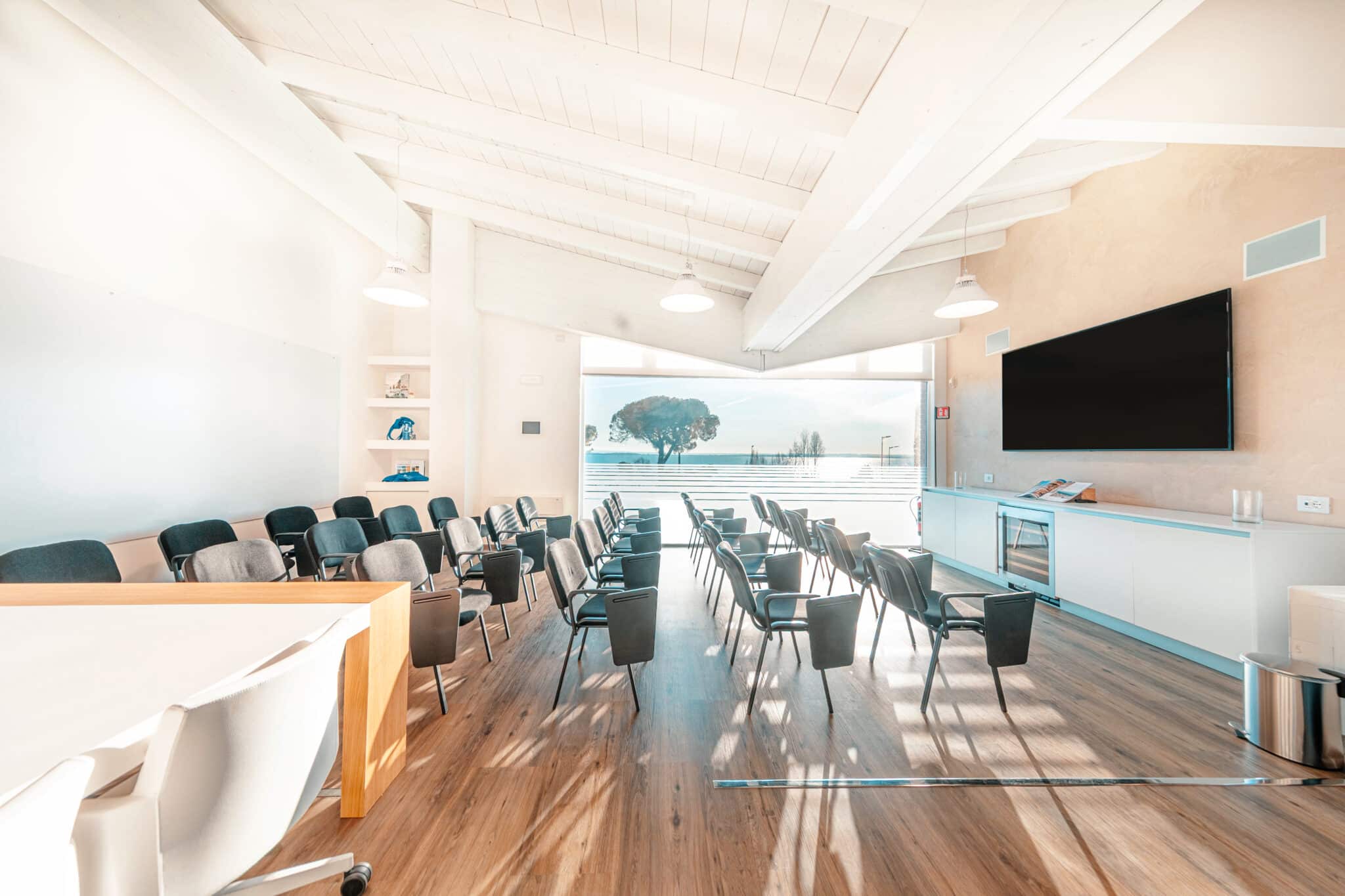 2. Una zona con tavolo presidenziale, 14 poltrone e Smart TV.