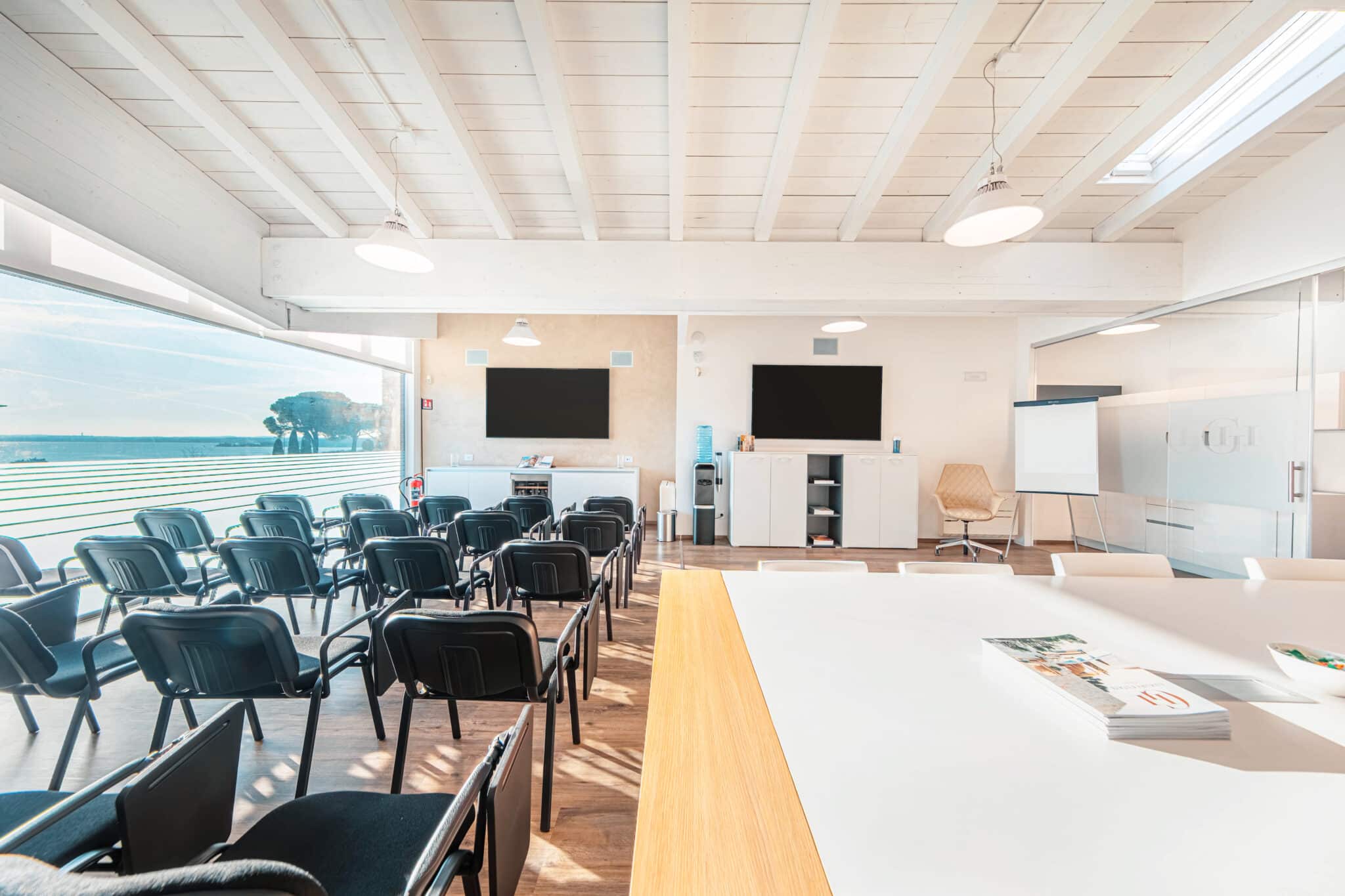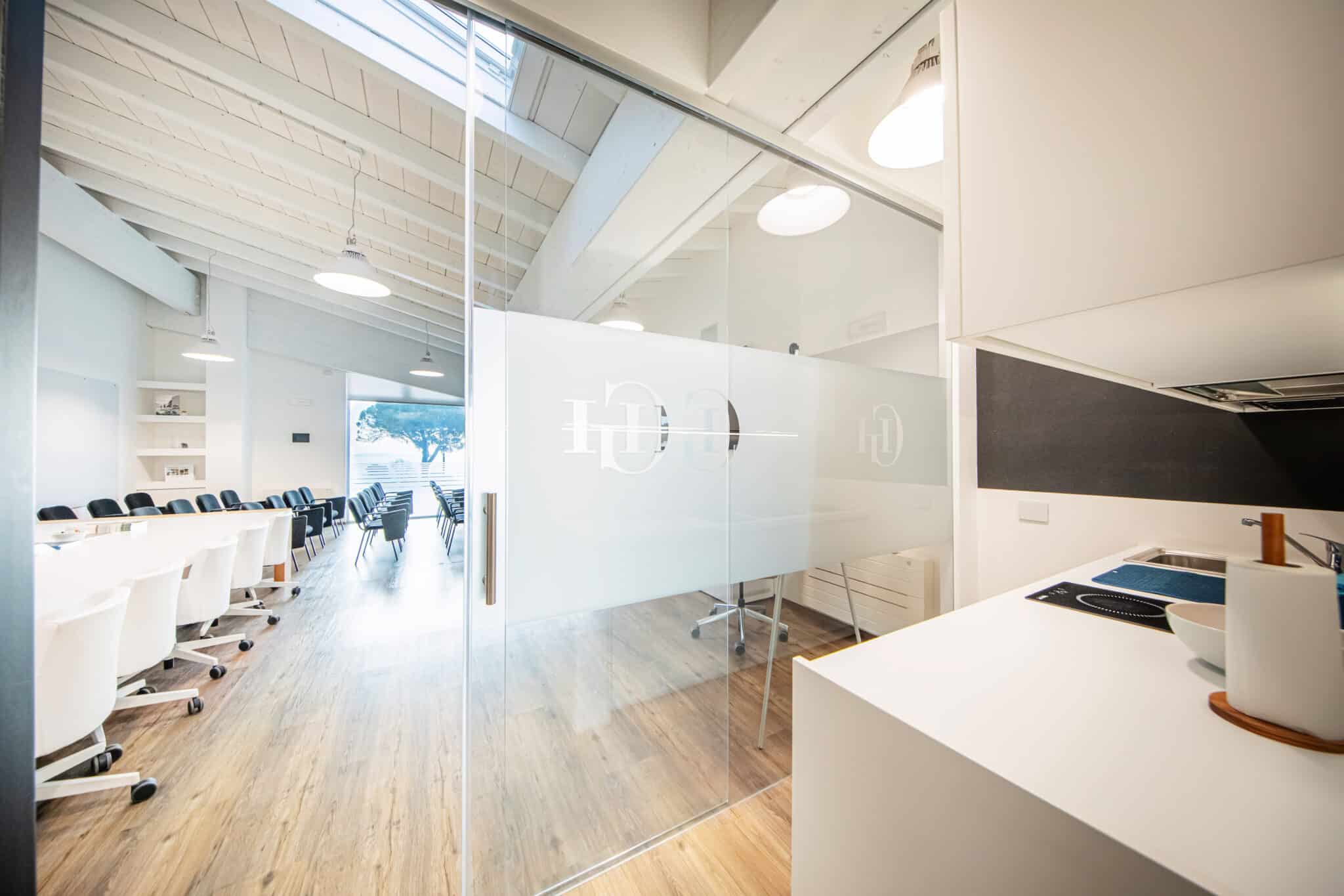 Sala riunioni moderna situata al primo piano di un edificio in una zona commerciale servita da ristoranti, supermercati e negozi. Lo spazio, totalmente rinnovato e con vista lago, dispone di due aree distinte: