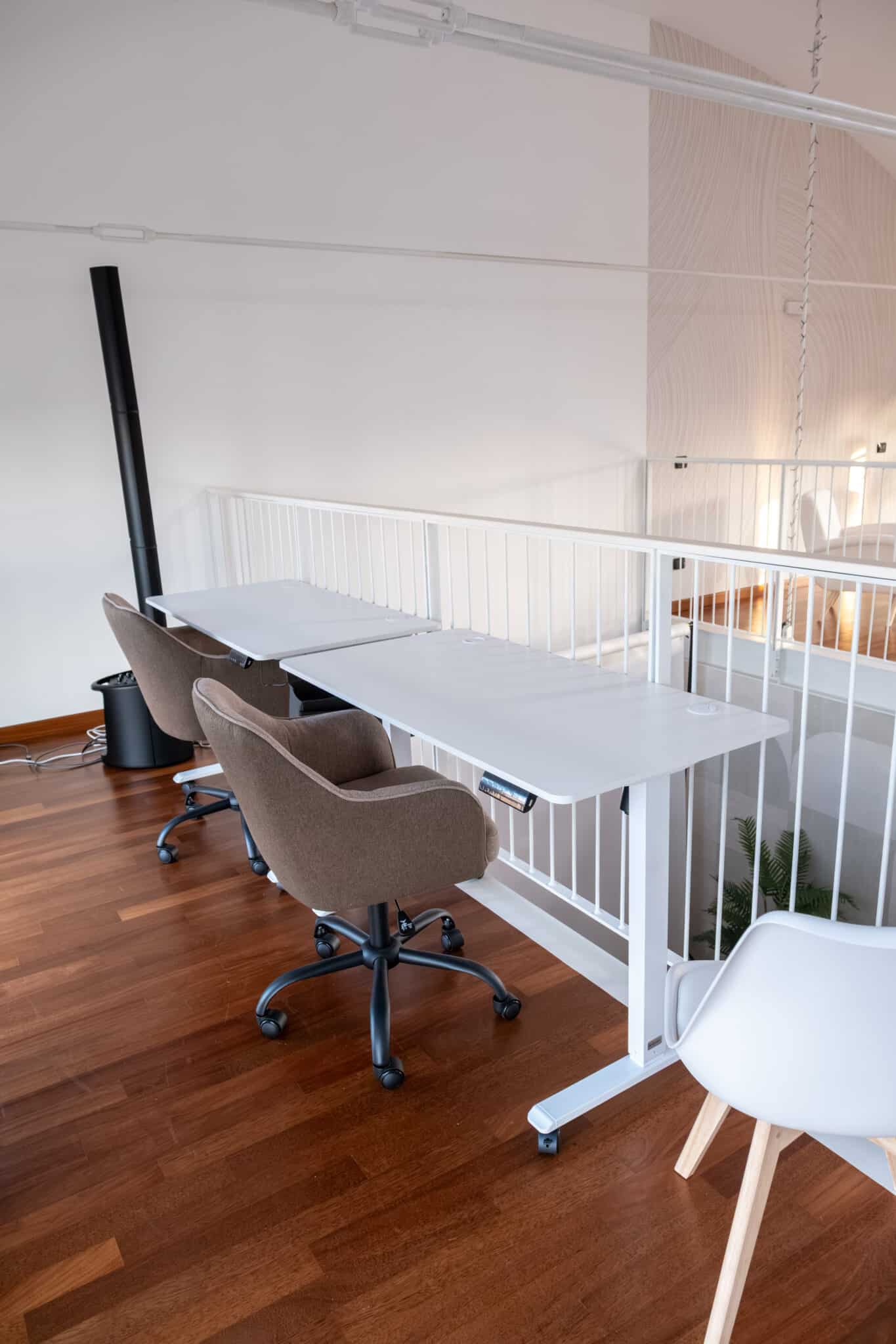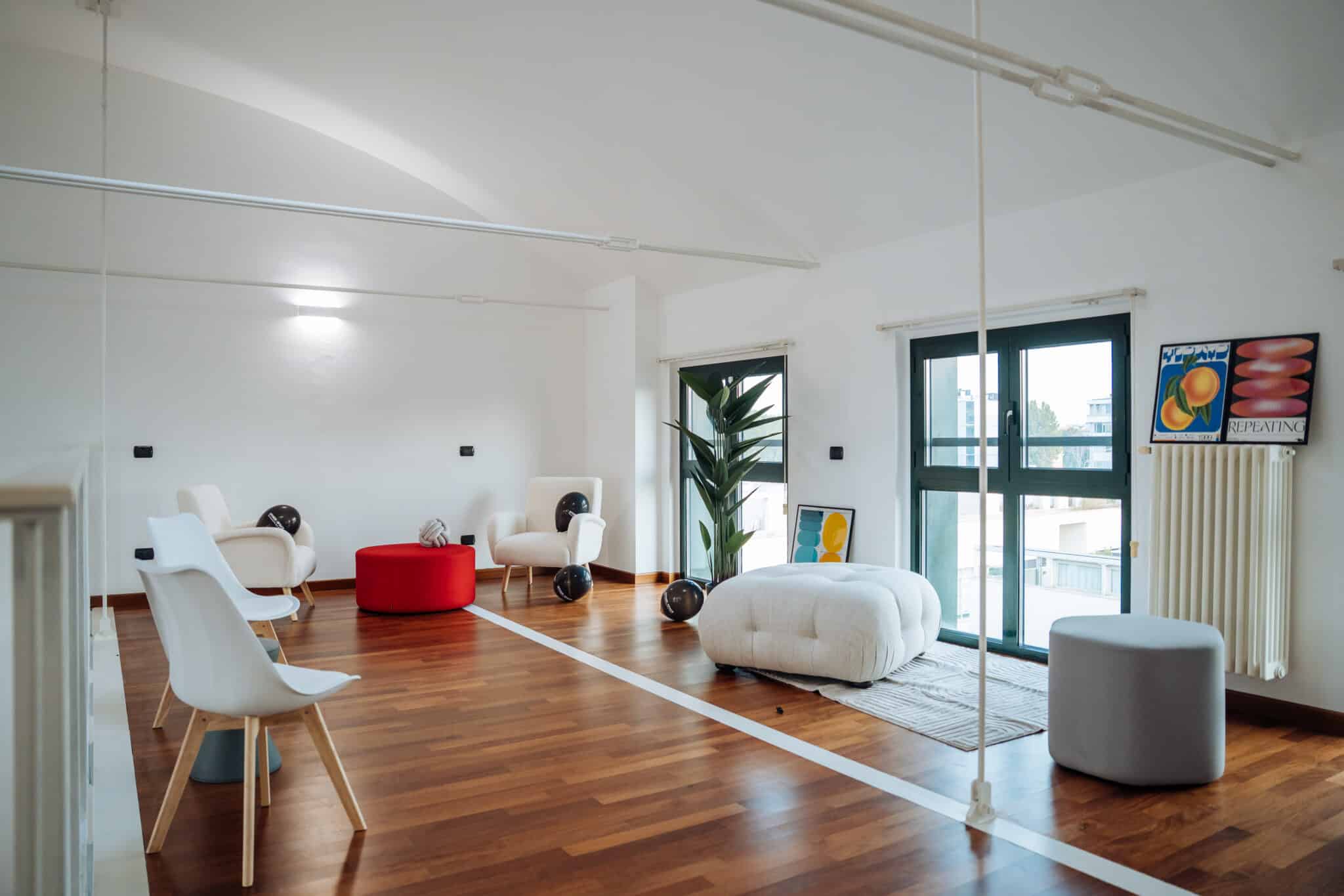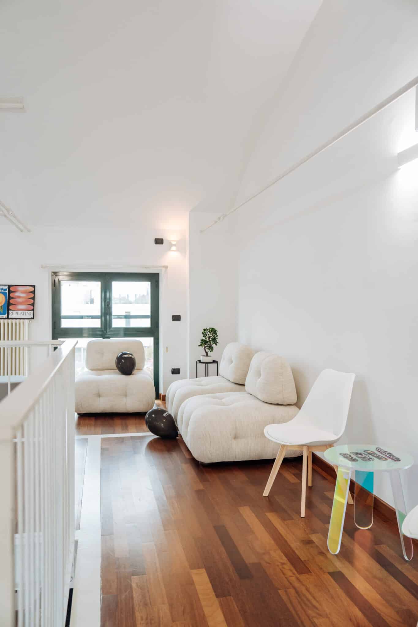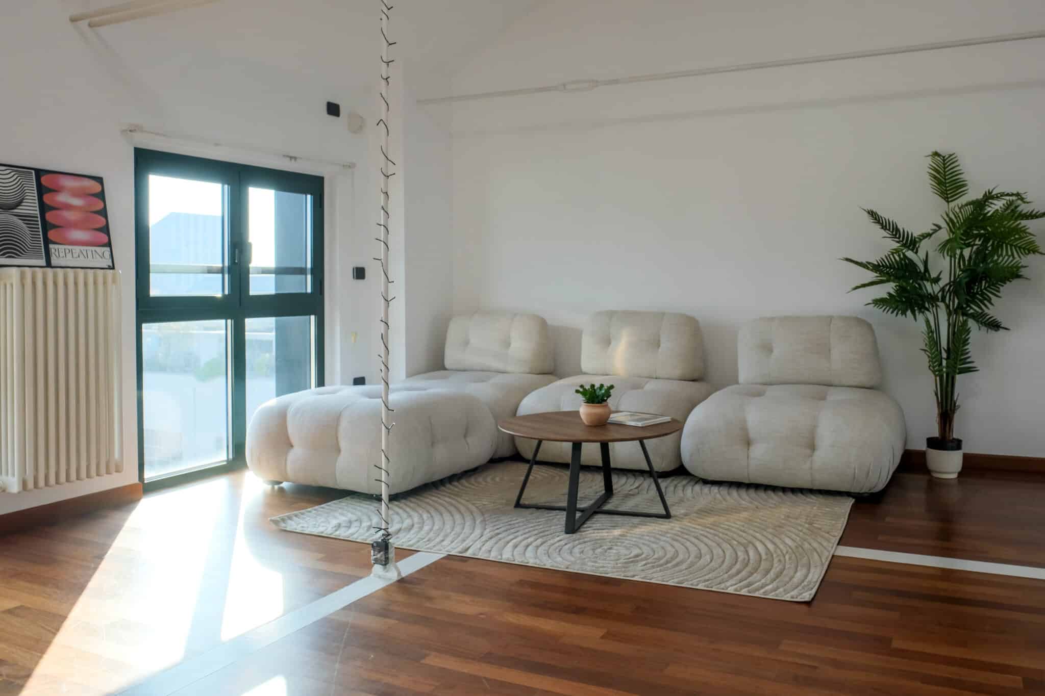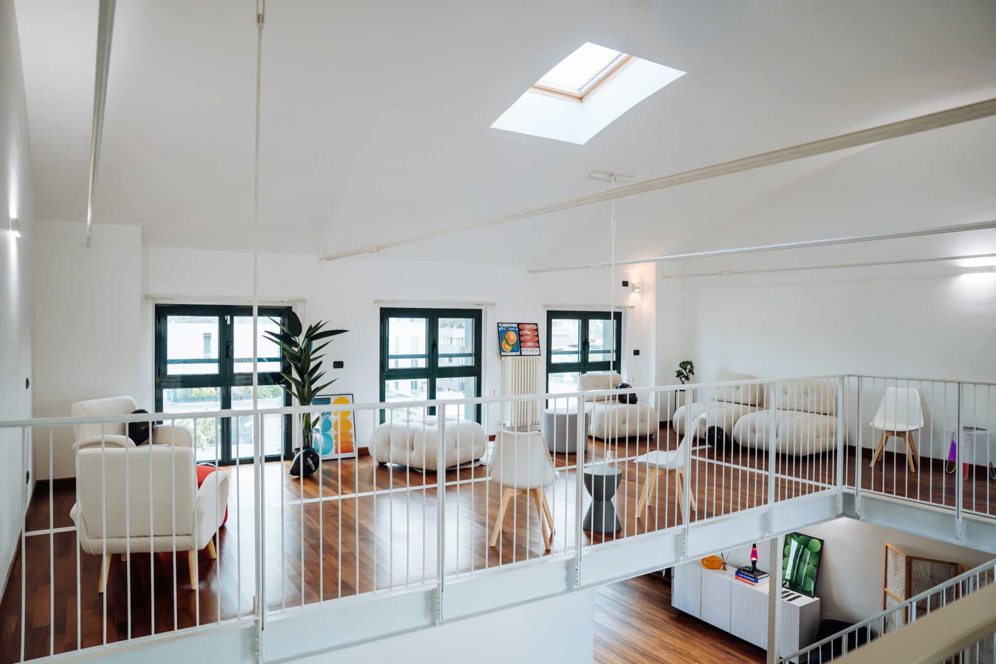 Gli arredi di design, essenziali e mobili, accompagnano senza vincolare: divani modulari, sedute, poltrone e postazioni di lavoro si spostano facilmente per dare ritmo a workshop, brainstorming o allestimenti espositivi.