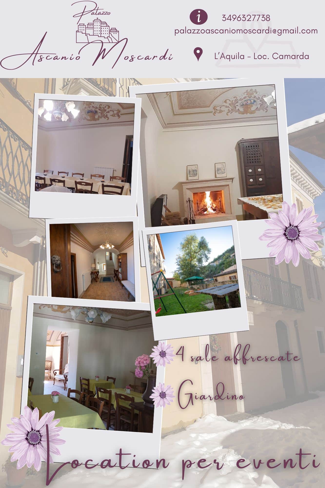 Immerso nella tranquillità della frazione di Camarda alle porte de L'Aquila, sorge Palazzo Ascanio Moscardi, un'affascinante dimora storico-artistica del XIX secolo. Recentemente ristrutturato e con un passato illustre che lo ha visto residenza del Podestà e in seguito del Medico Condotto, il Palazzo oggi ospita una struttura ricettiva ed è ideale come location esclusiva per eventi, meeting e workshop aziendali o privati.
