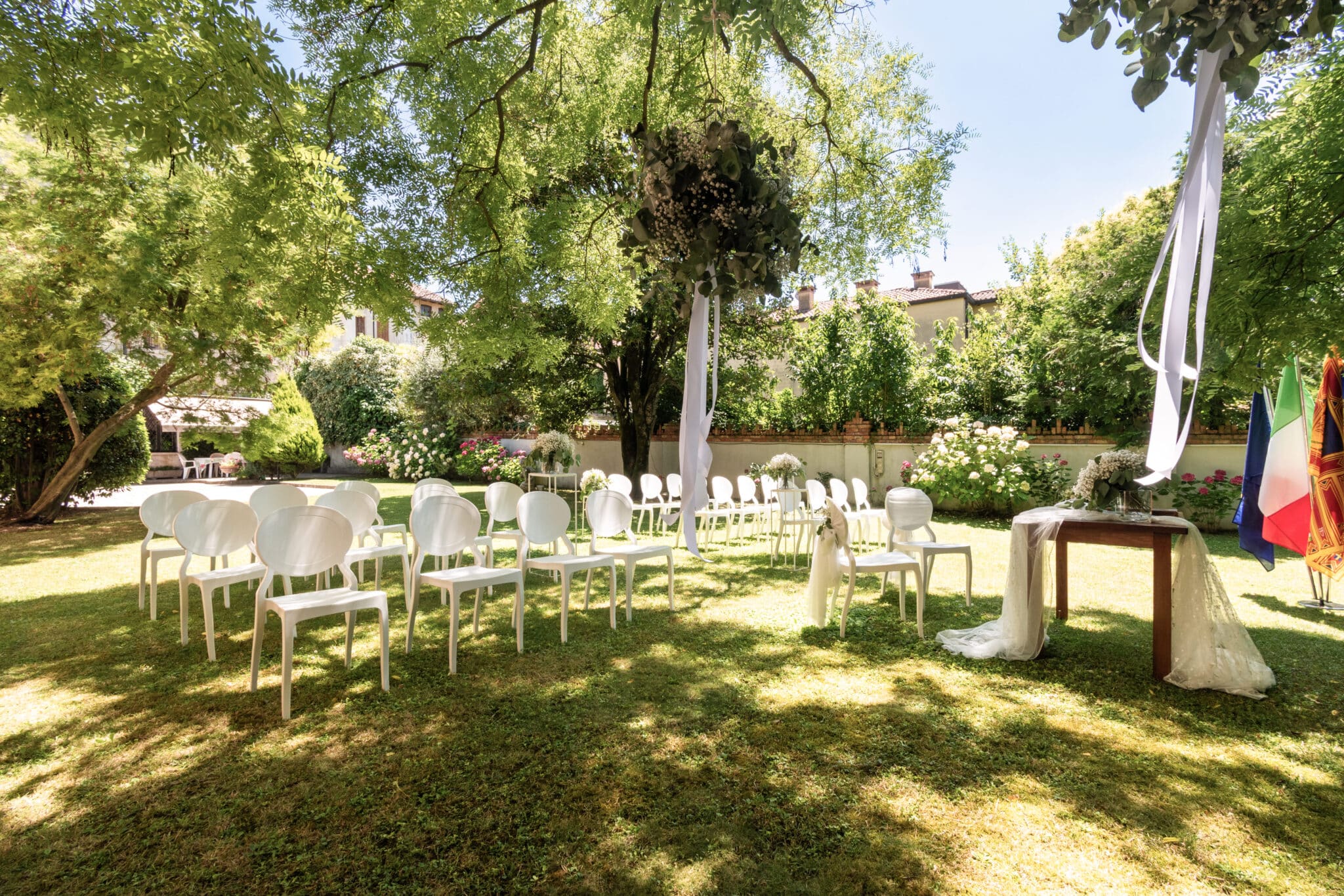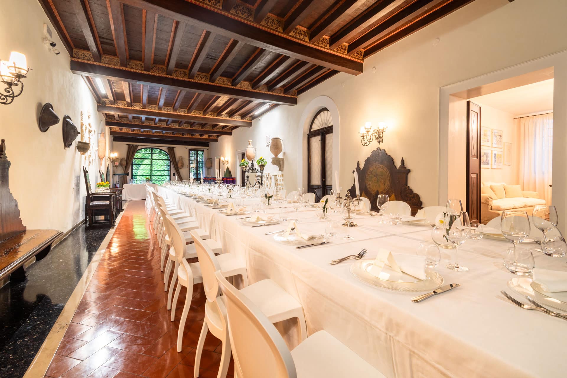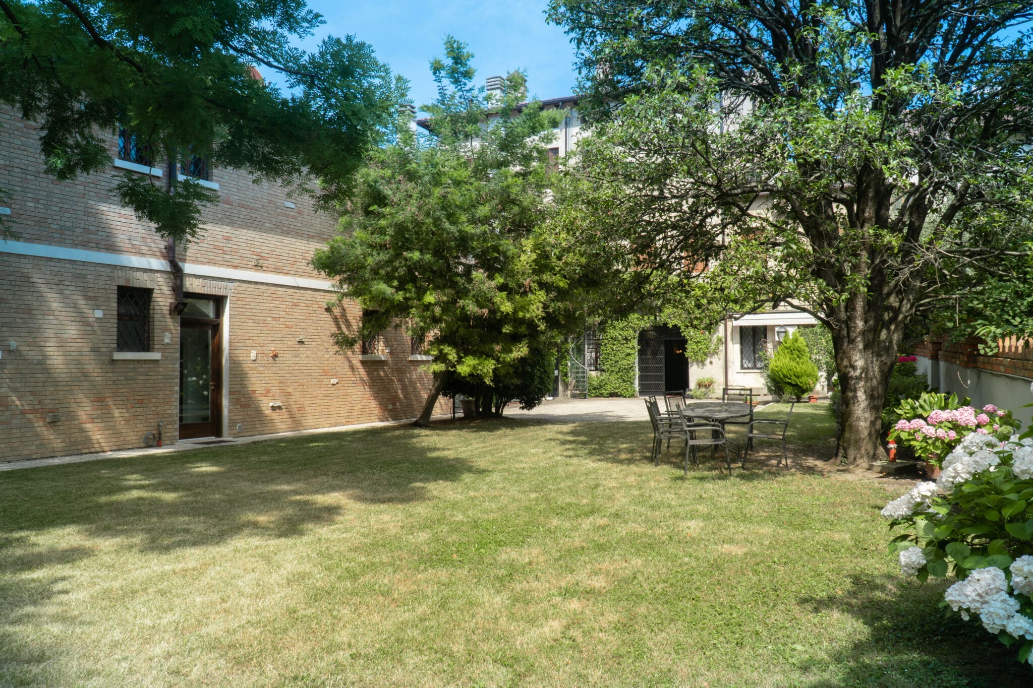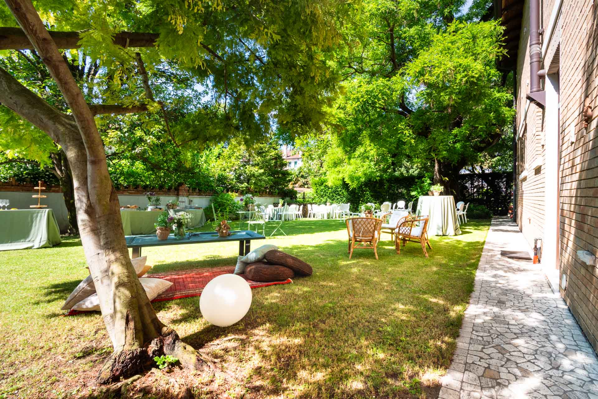 Ma è all'esterno che si svela tutta la sua magia. Il giardino, ricco di piante ombrose e incorniciato da un prato che si estende fino al fiume, offre uno scenario da sogno per ogni tipo di evento. Qui potrete celebrare una cerimonia conviviale, immersi in un'atmosfera raccolta e raffinata, o organizzare un meeting di lavoro che si distinguerà per importanza e prestigio.
