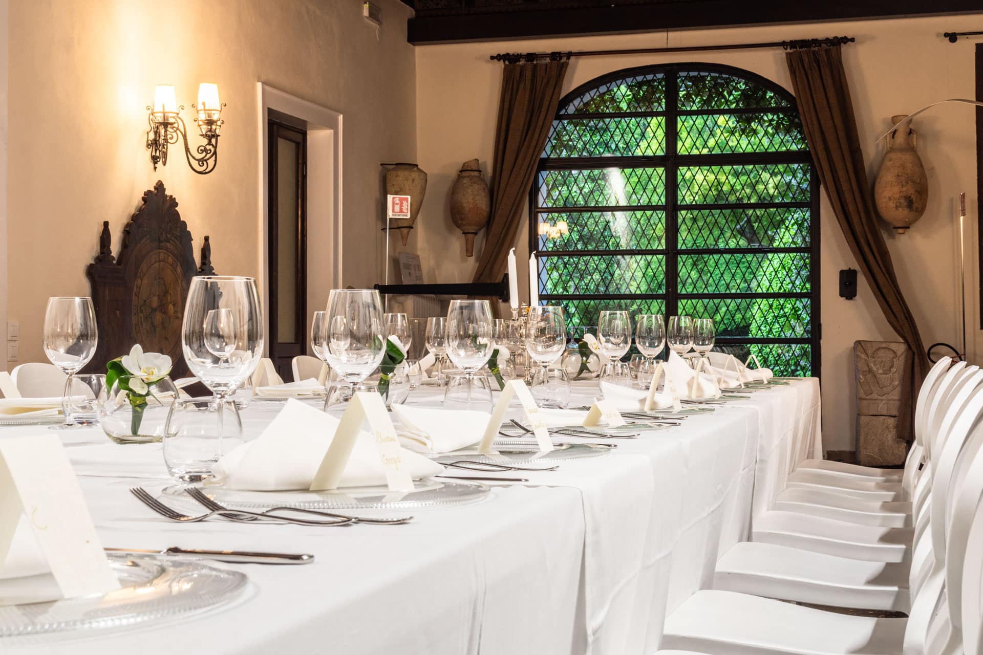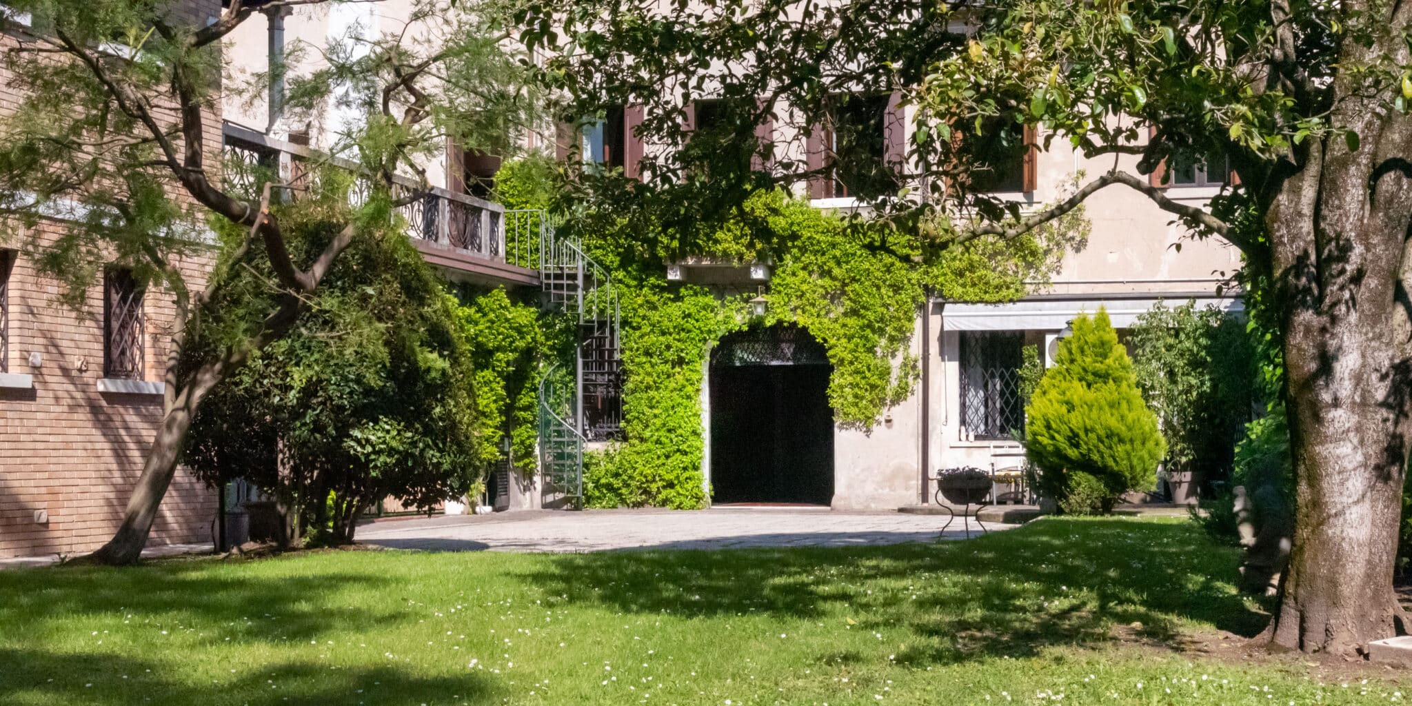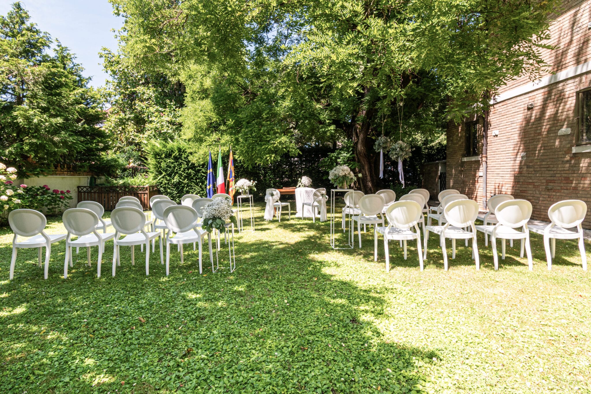 Ma è all'esterno che si svela tutta la sua magia. Il giardino, ricco di piante ombrose e incorniciato da un prato che si estende fino al fiume, offre uno scenario da sogno per ogni tipo di evento. Qui potrete celebrare una cerimonia conviviale, immersi in un'atmosfera raccolta e raffinata, o organizzare un meeting di lavoro che si distinguerà per importanza e prestigio.