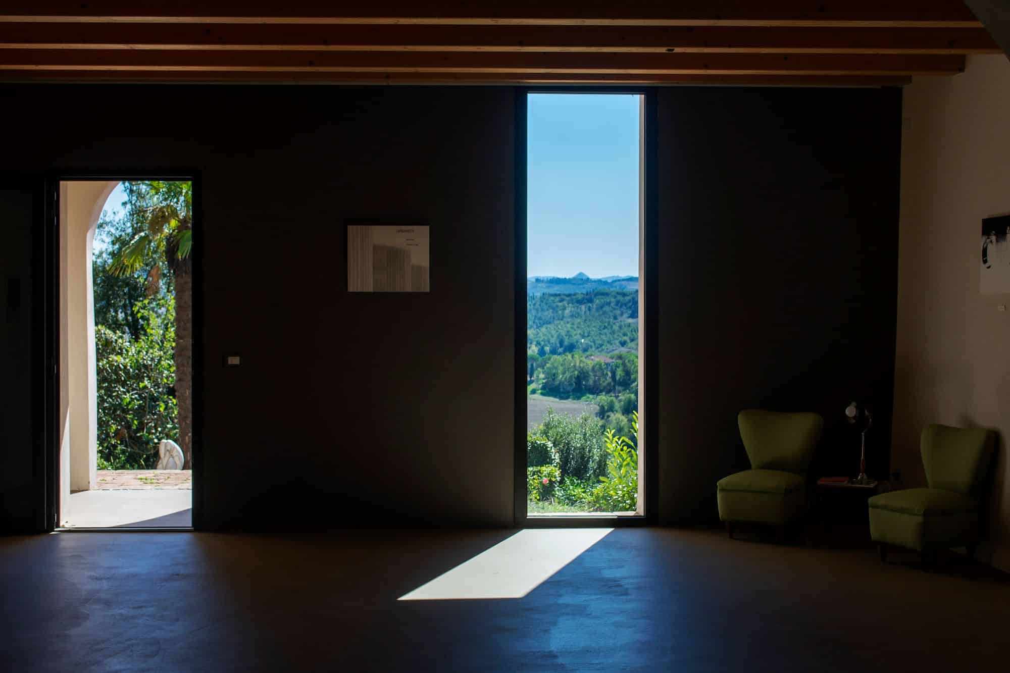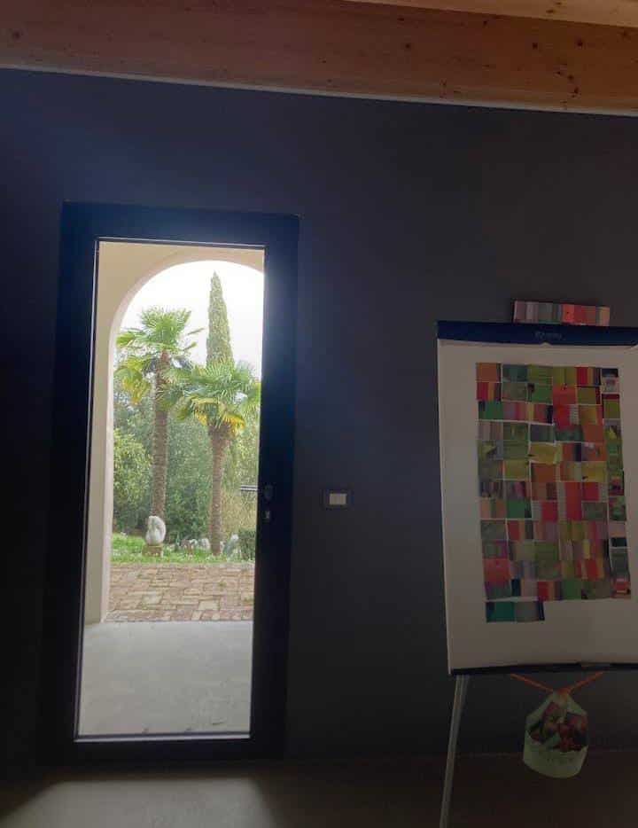 Abbiamo una grande sala meeting con lo schermo fisso, abbiamo anche lo schermo tripod e la lavagna a fogli mobili, video proiettore, sedie da conferenza, microfoni, amplificazione, 3kw di potenza elettrica.