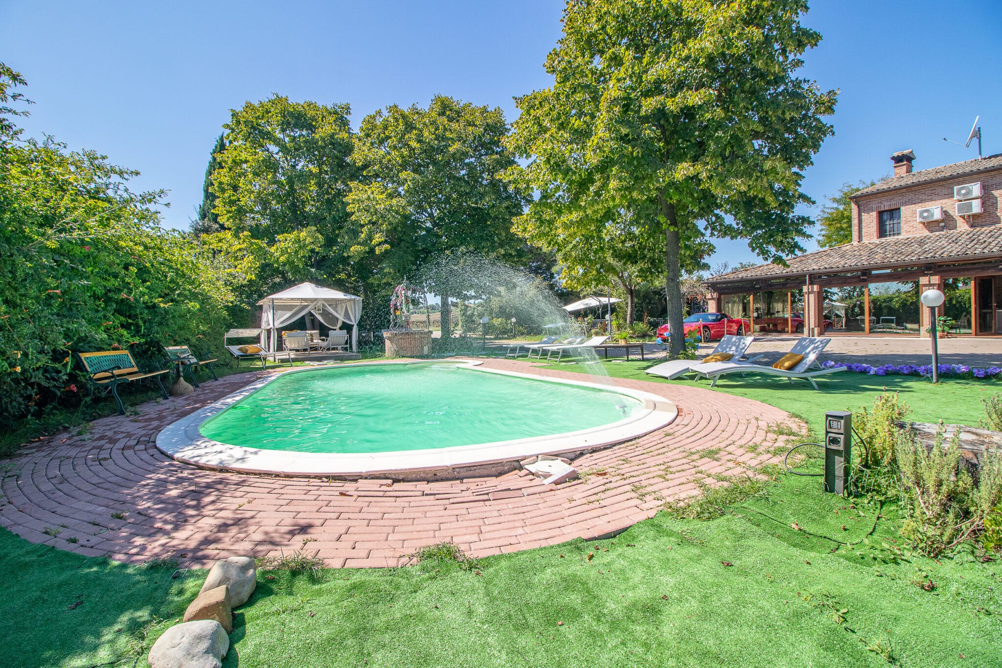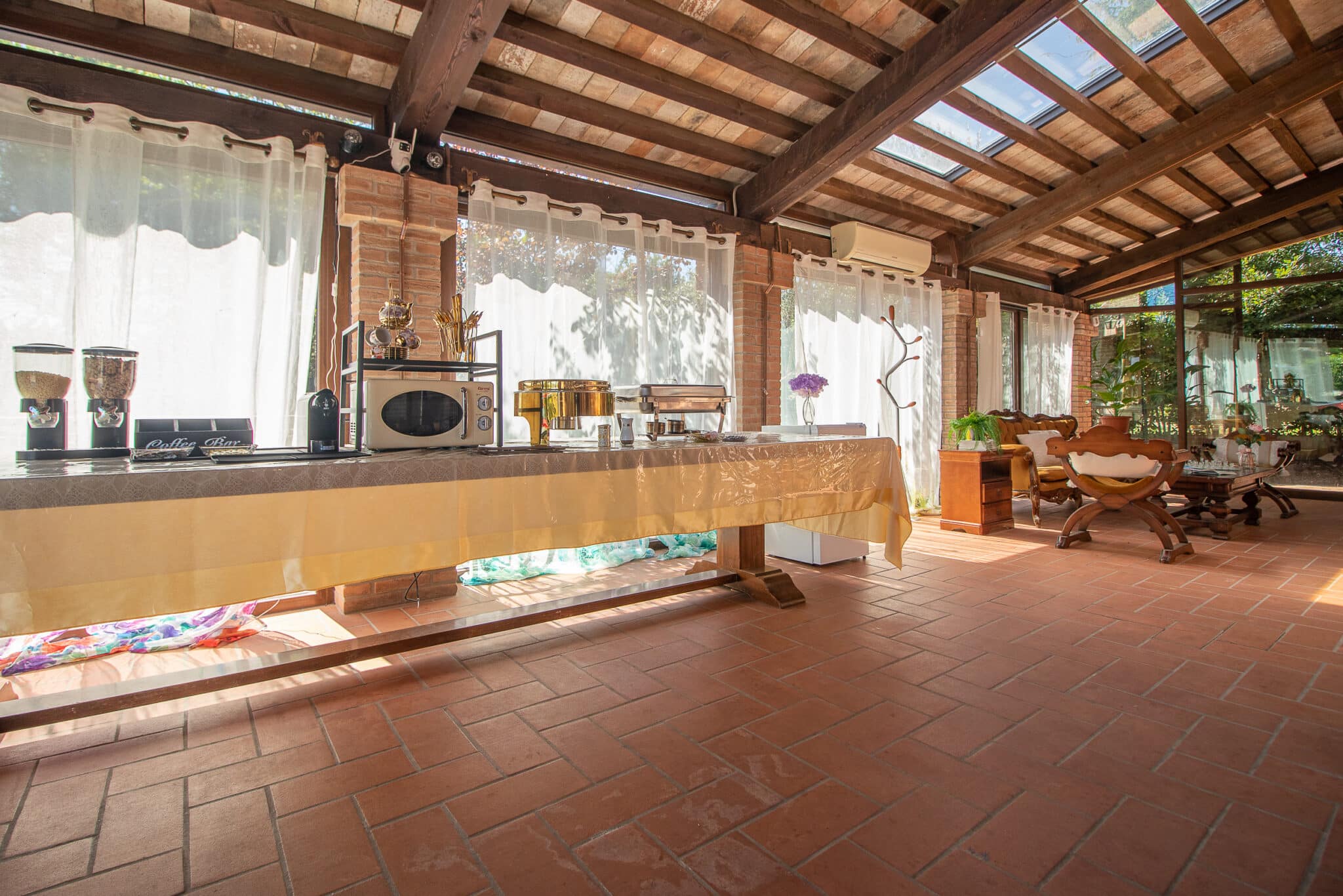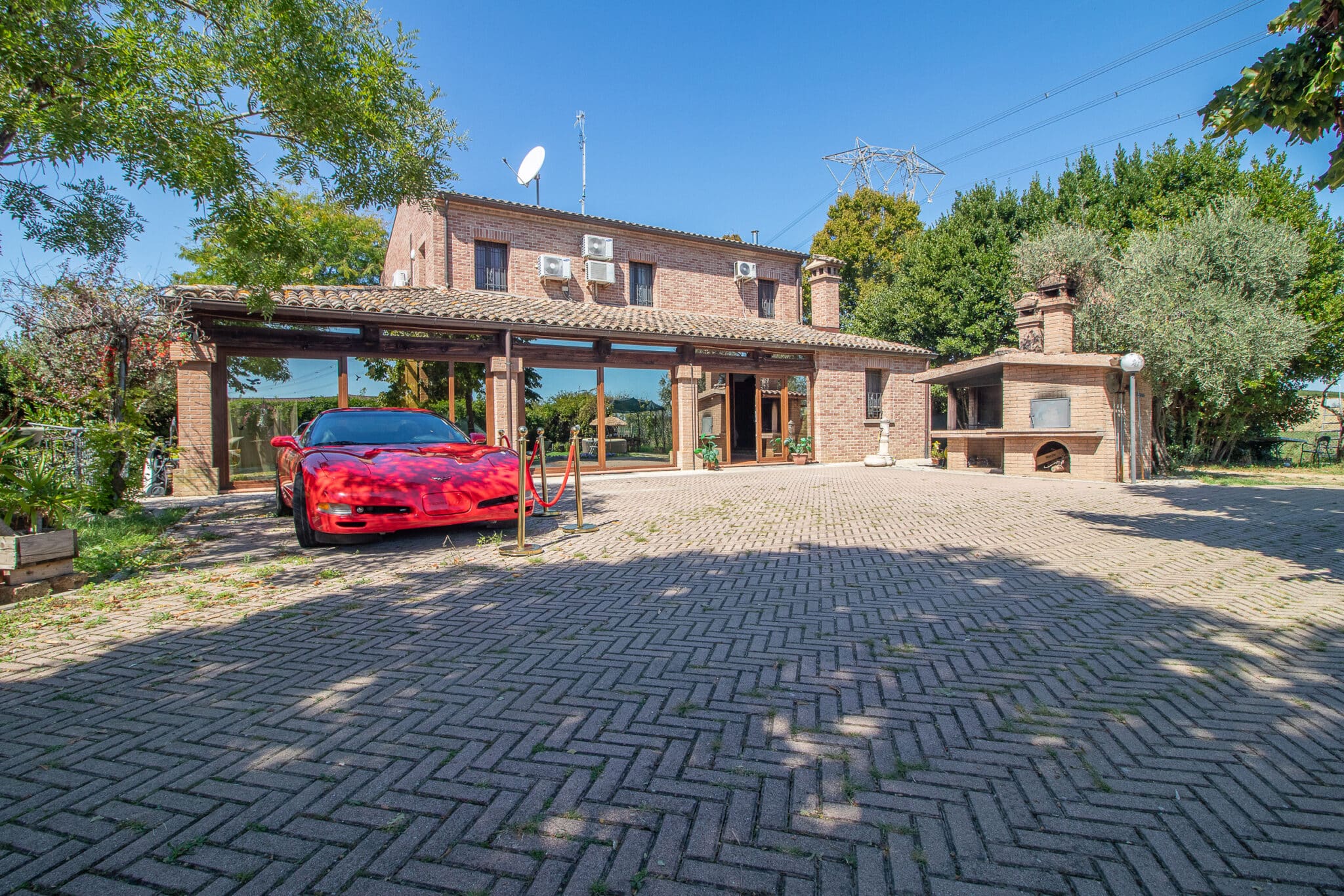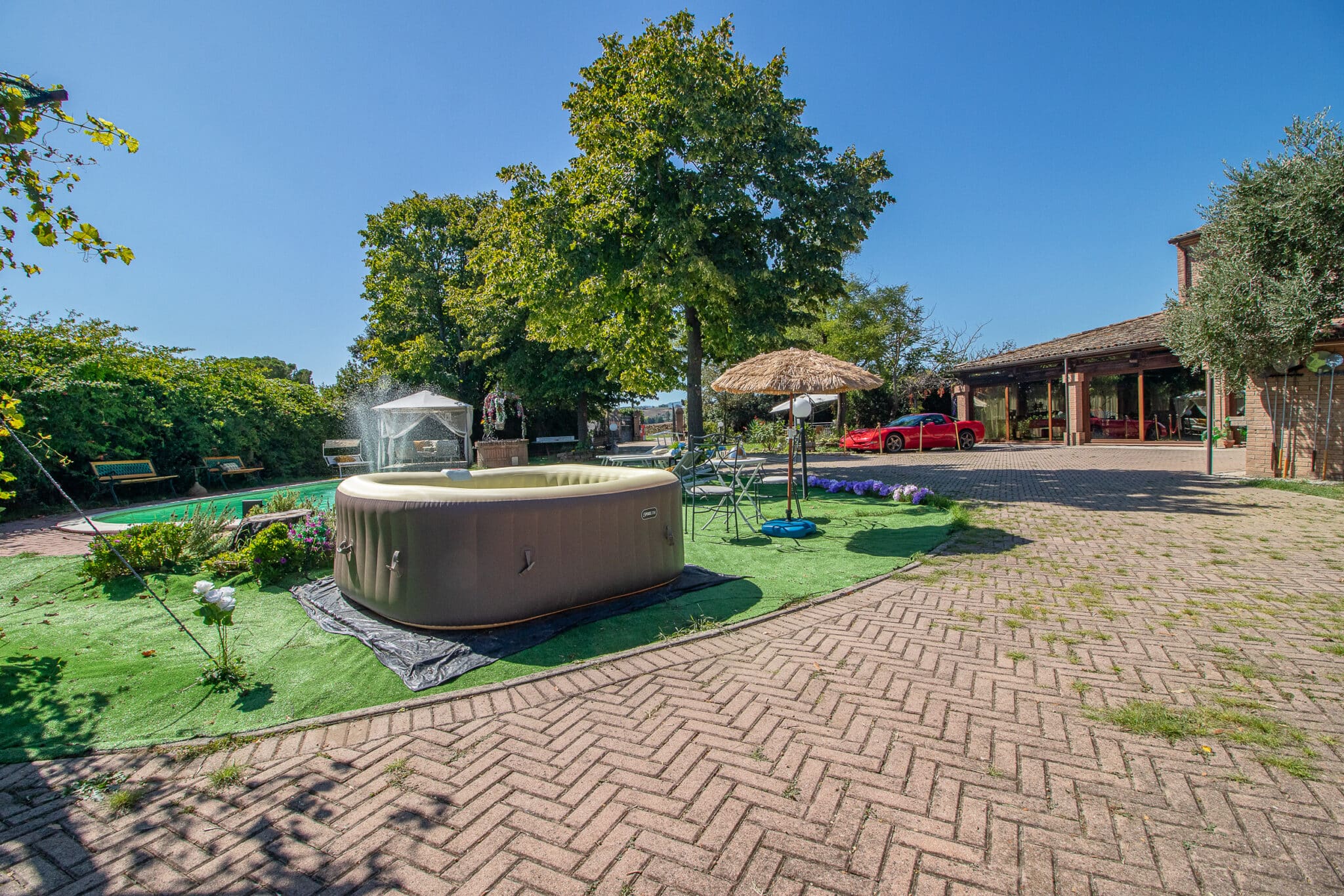 Gli ampi spazi esterni con piscina, idromassaggio e portico attrezzato consentono di organizzare ricevimenti all’aperto in un’atmosfera raffinata, mentre gli interni della villa, curati nei minimi dettagli, garantiscono ambienti accoglienti anche per eventi in ogni stagione.